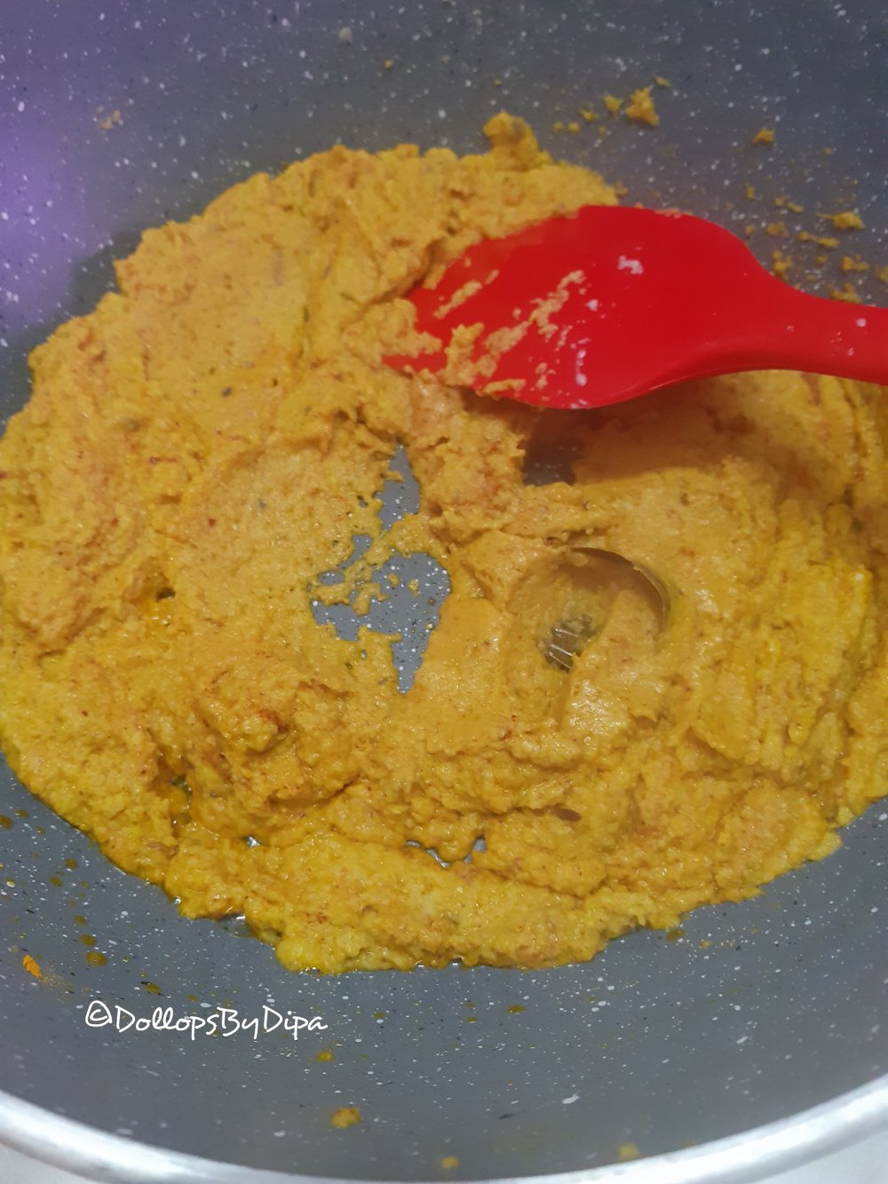 5. Now cover the pan and cook this paste till it changes colour and ghee comes on the top. Stir occasionally to avoid sticking on the bottom.