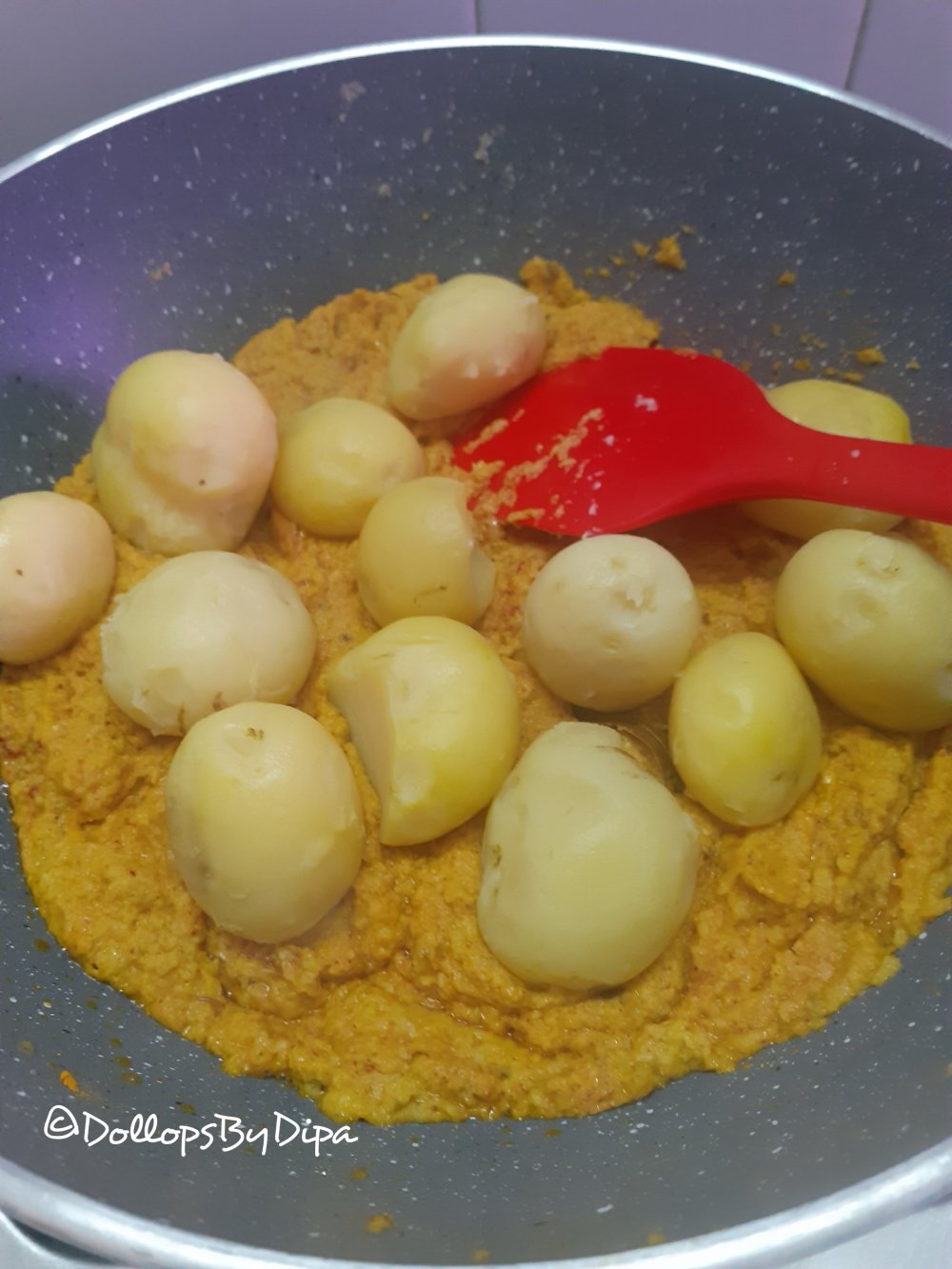 7. Add peeled and pricked potatoes and mix well with cooked paste.