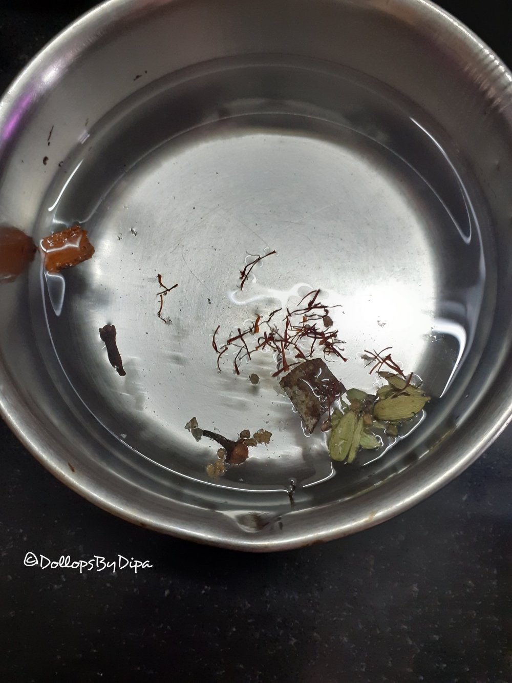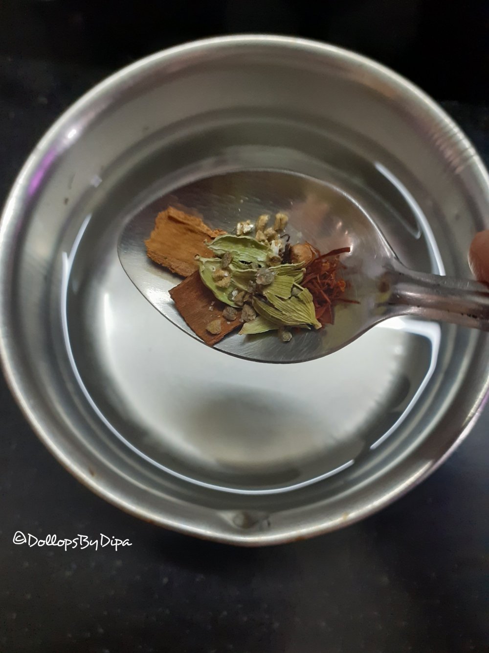 1. Add saffron , cinnamon, cloves, cardamoms and rose petal in 3 cups of water. Turn on the flame and simmer it for 3-5 minutes after one boil.