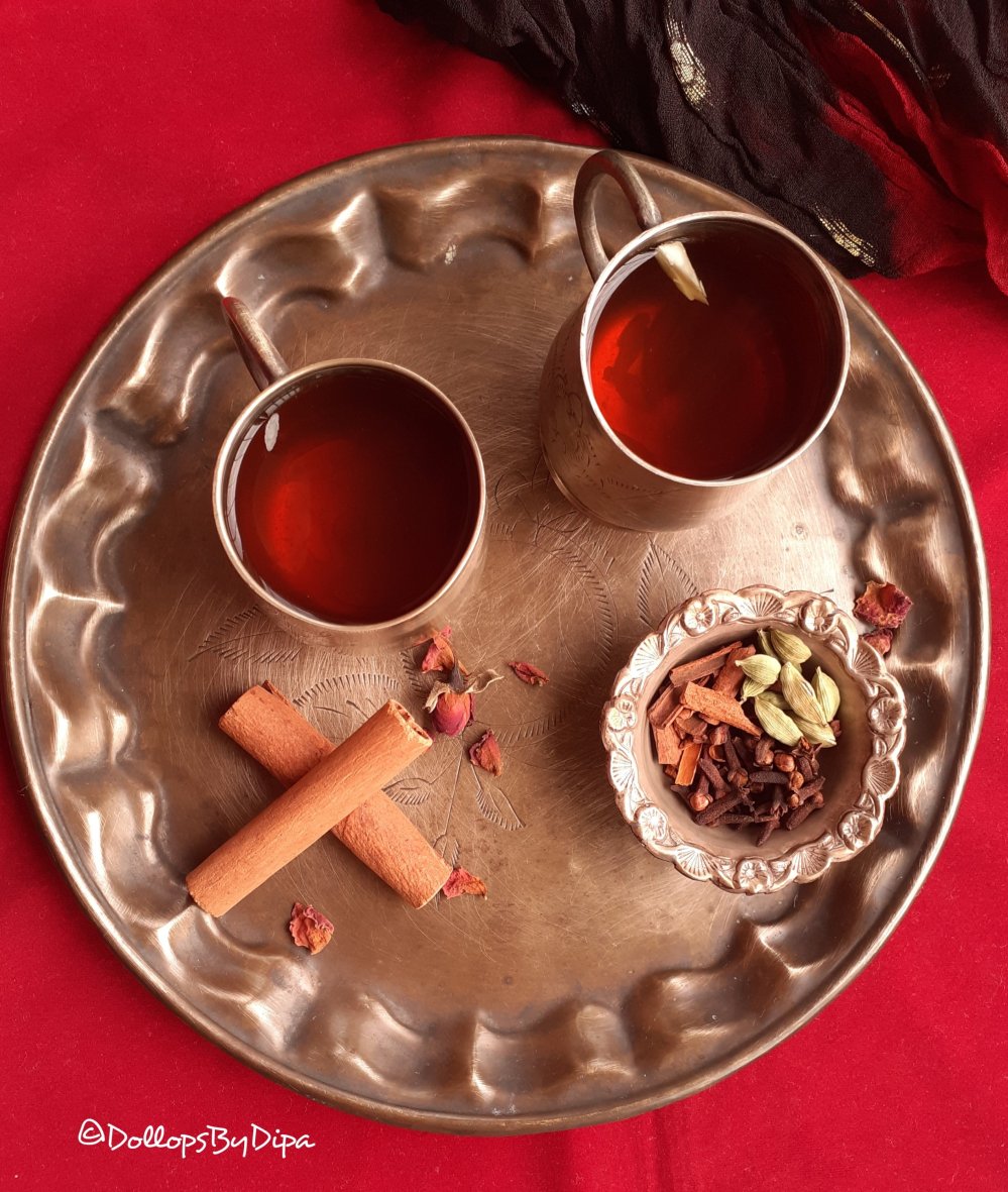 Kashmiri Kahwa is traditional Kashmiri tea flavoured with cardamom and infused with cloves, cinnamon , saffron and rose petals. It is prepared in a brass kettle known as “Samovar”.