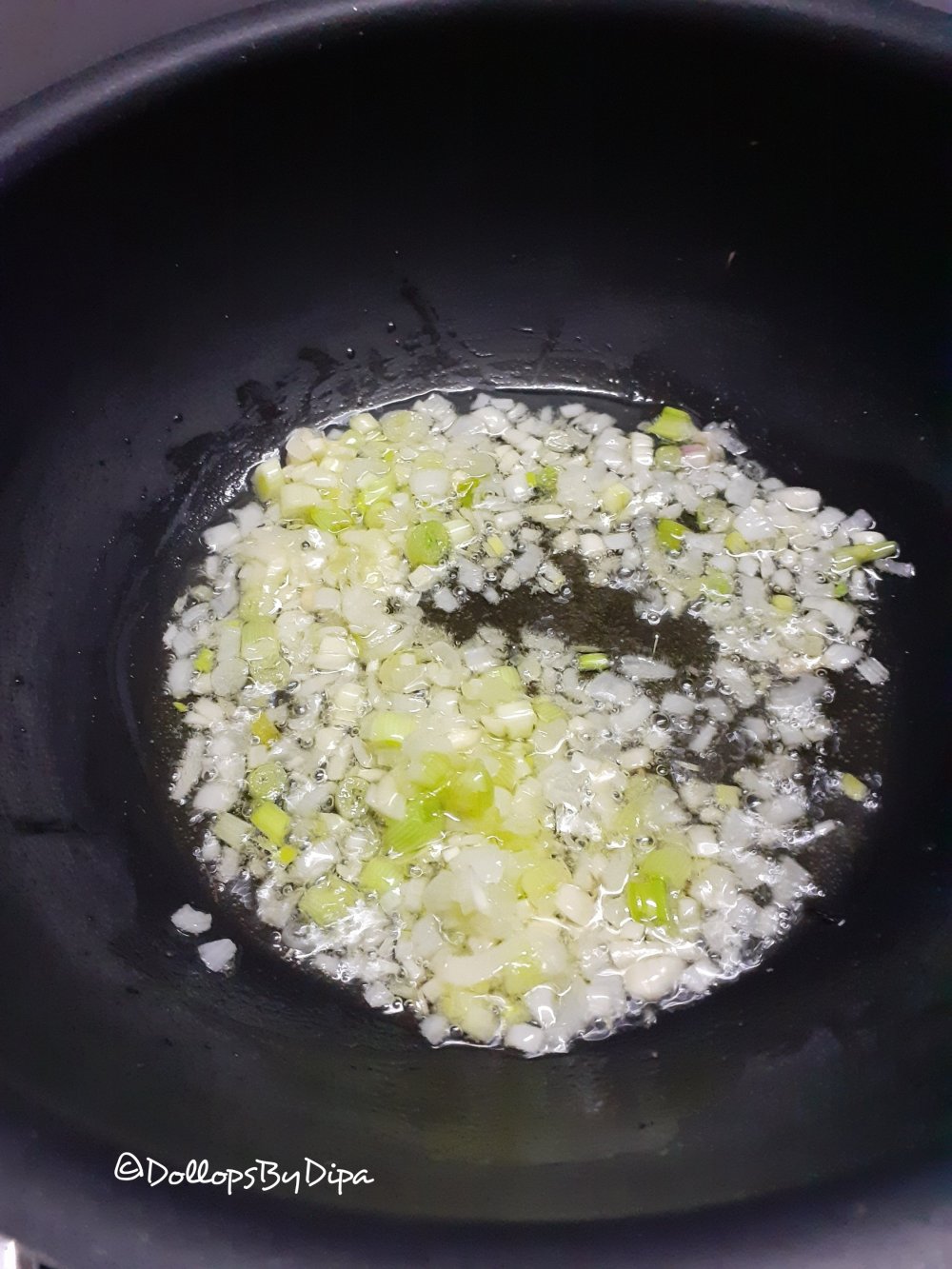 7. Lastly add vinegar, mix well and also add spring onion greens. Turn off the heat.