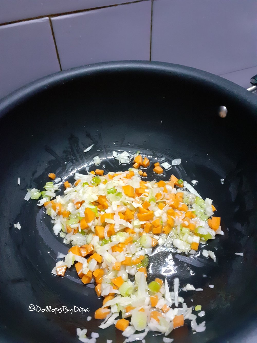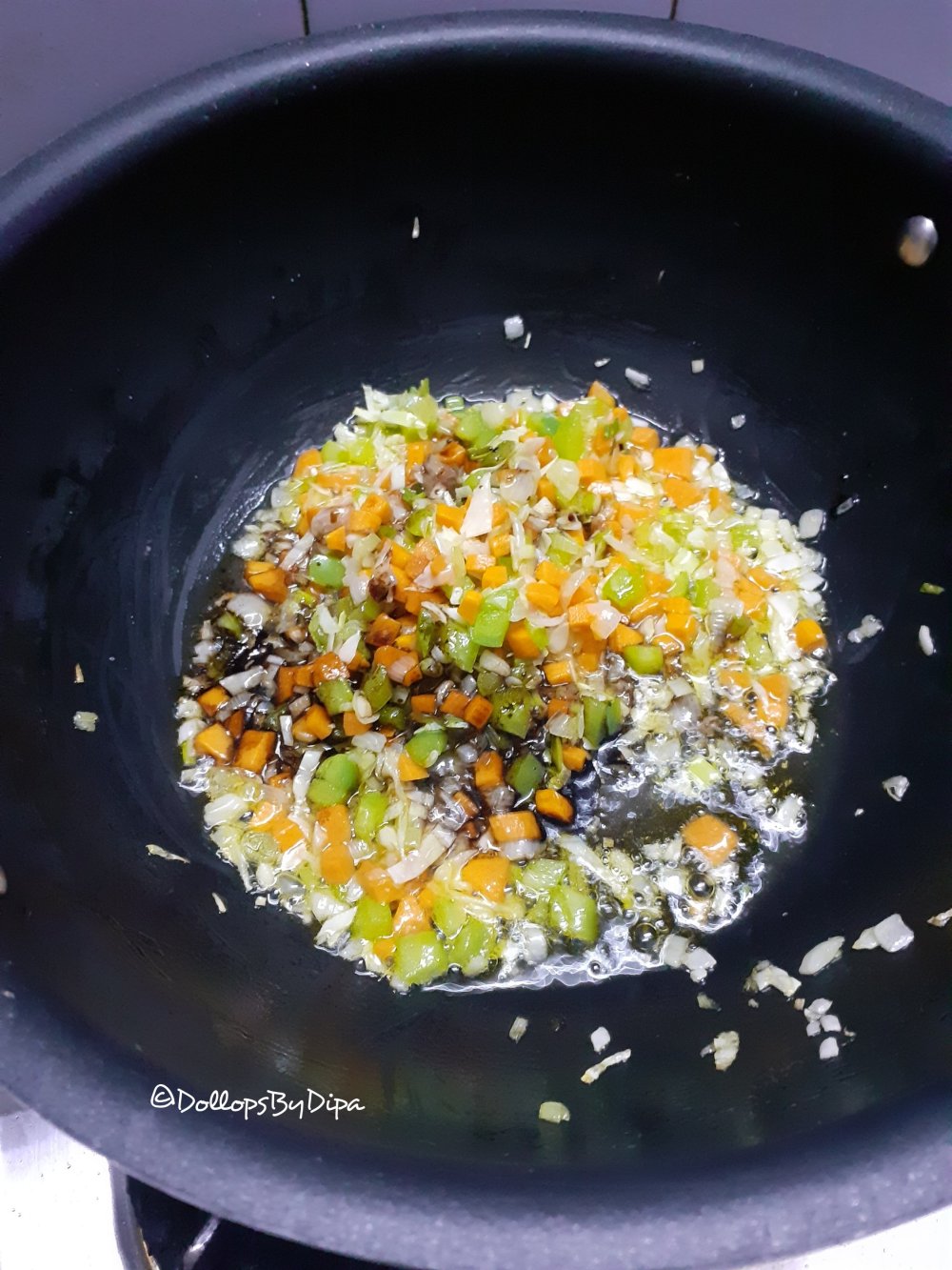 4. Then add all the veggies and stir fry it on a high flame. Keep stirring and tossing veggies for uniform cooking. This will keep the crunchiness of veggies intact and avoid burning of veggies.