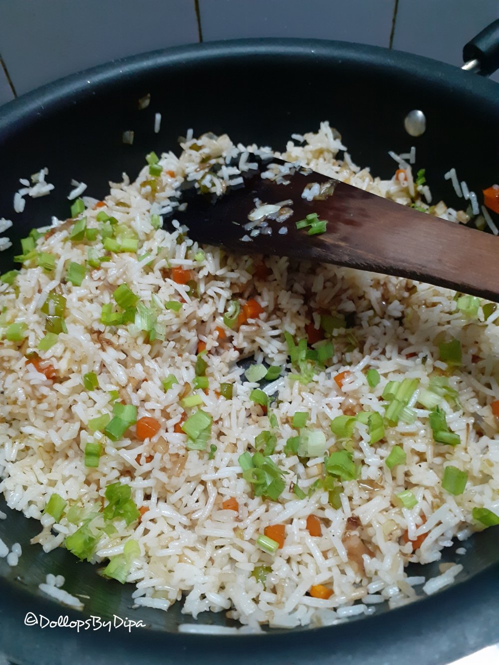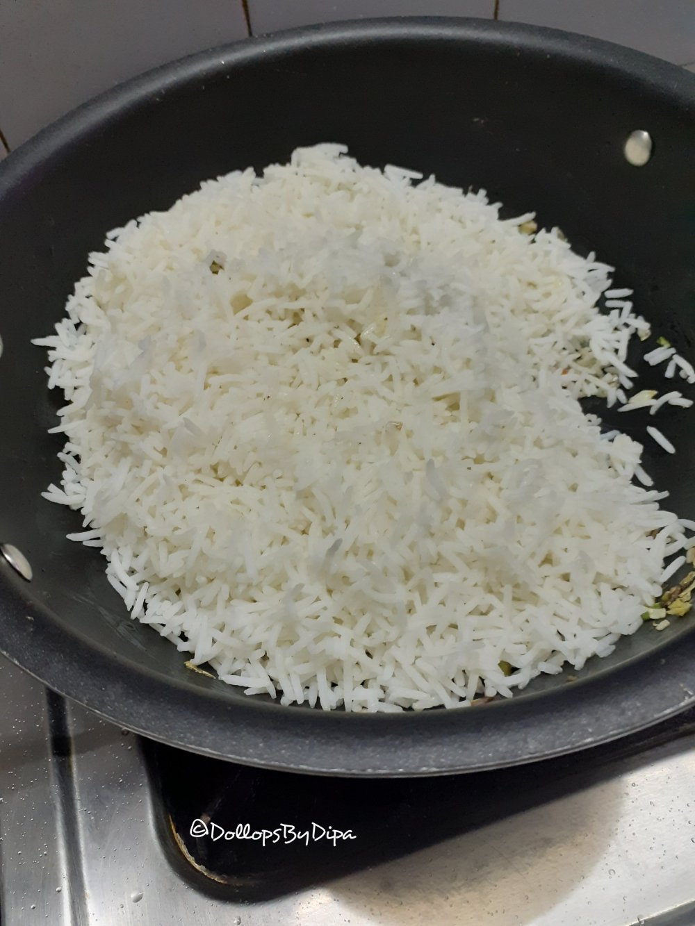 6. Add cooked rice and mix gently with veggies. Stir fry it for a couple of minutes.