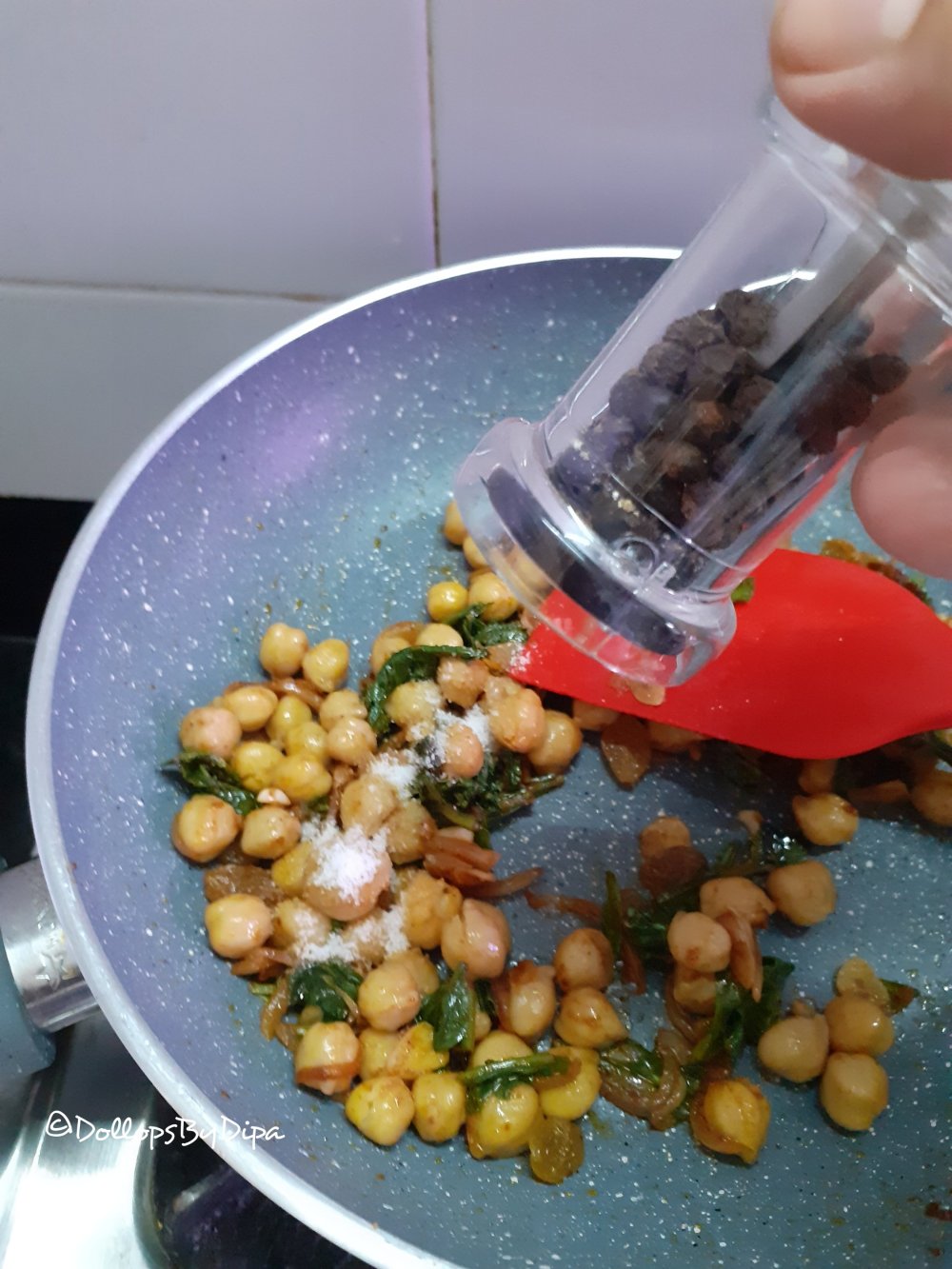 7. Now add chickpeas and raisins. Add salt and black peeper also. Mix well and cook for a couple of minutes on a slow flame. Turn off the flame.