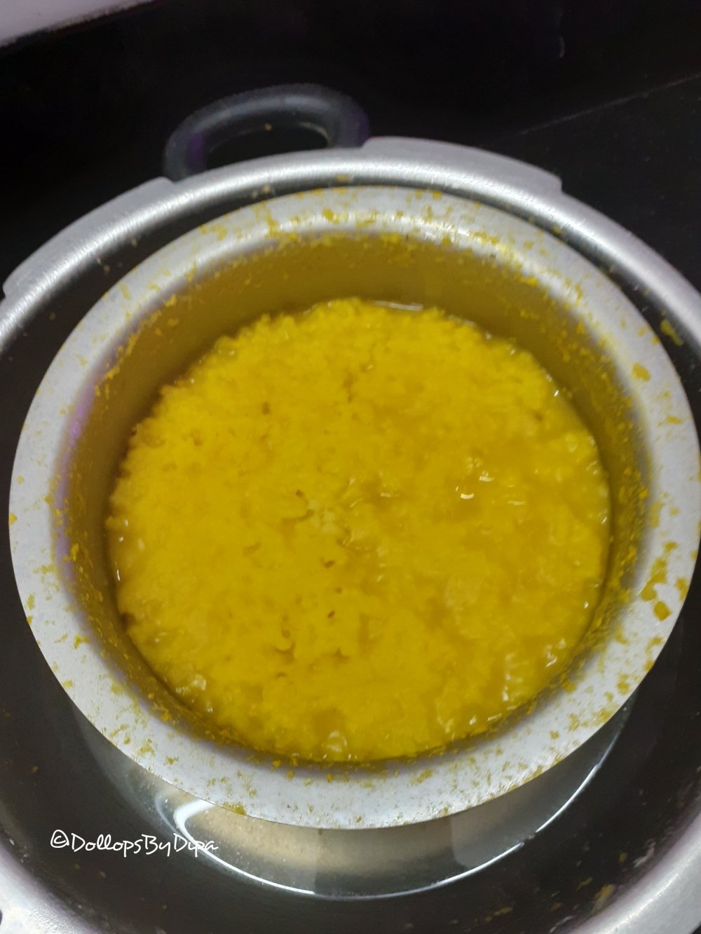 2. Then add salt and turmeric powder to it. Add 3 cups of water i.e. 1:3 ratio. (1 cup rice/dal so 3 cups water.). Pressure cook Khichdi.
