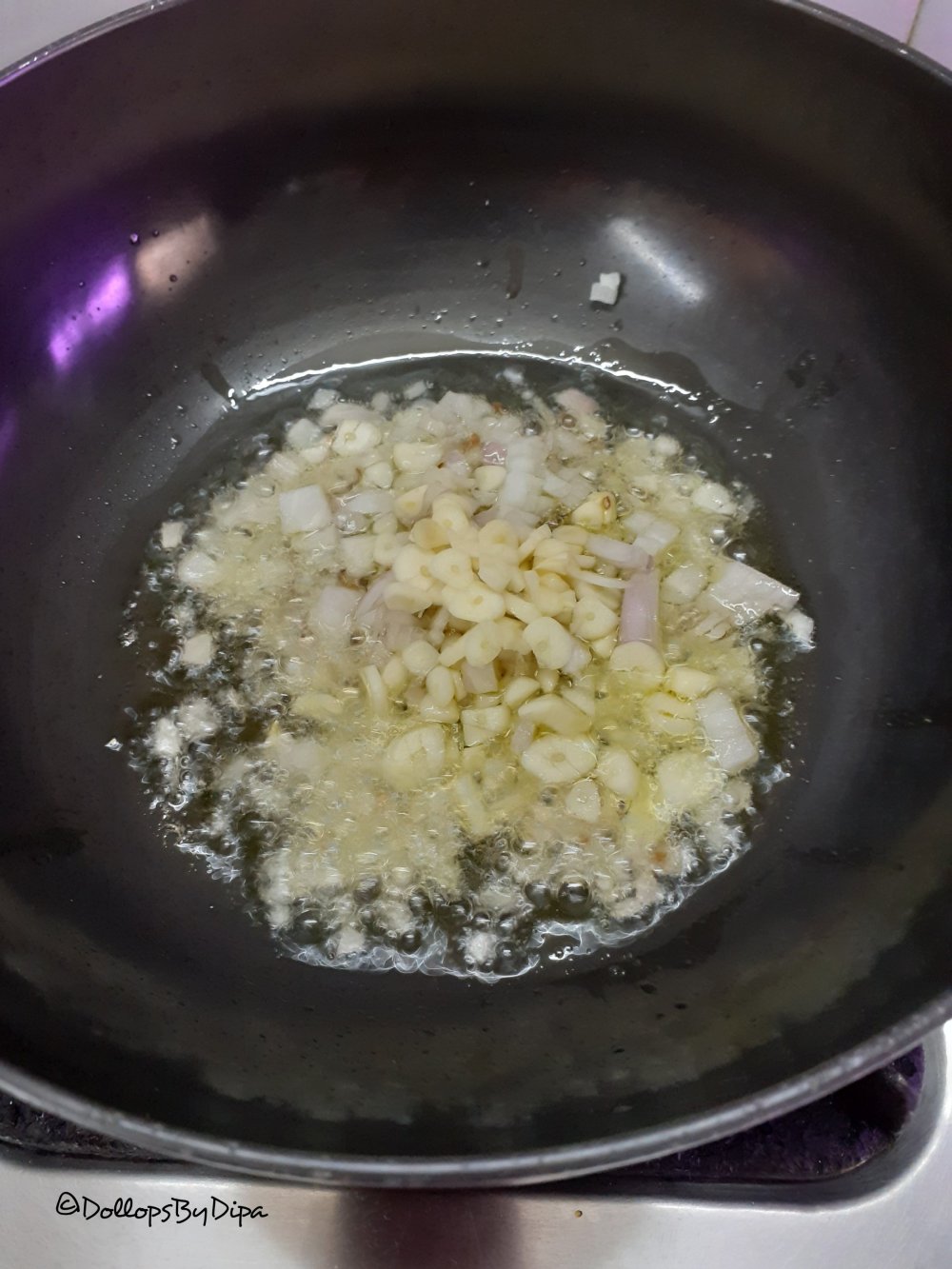 3. Heat ghee, add cumin seeds, once they splutter, add onion and garlic and saute them.