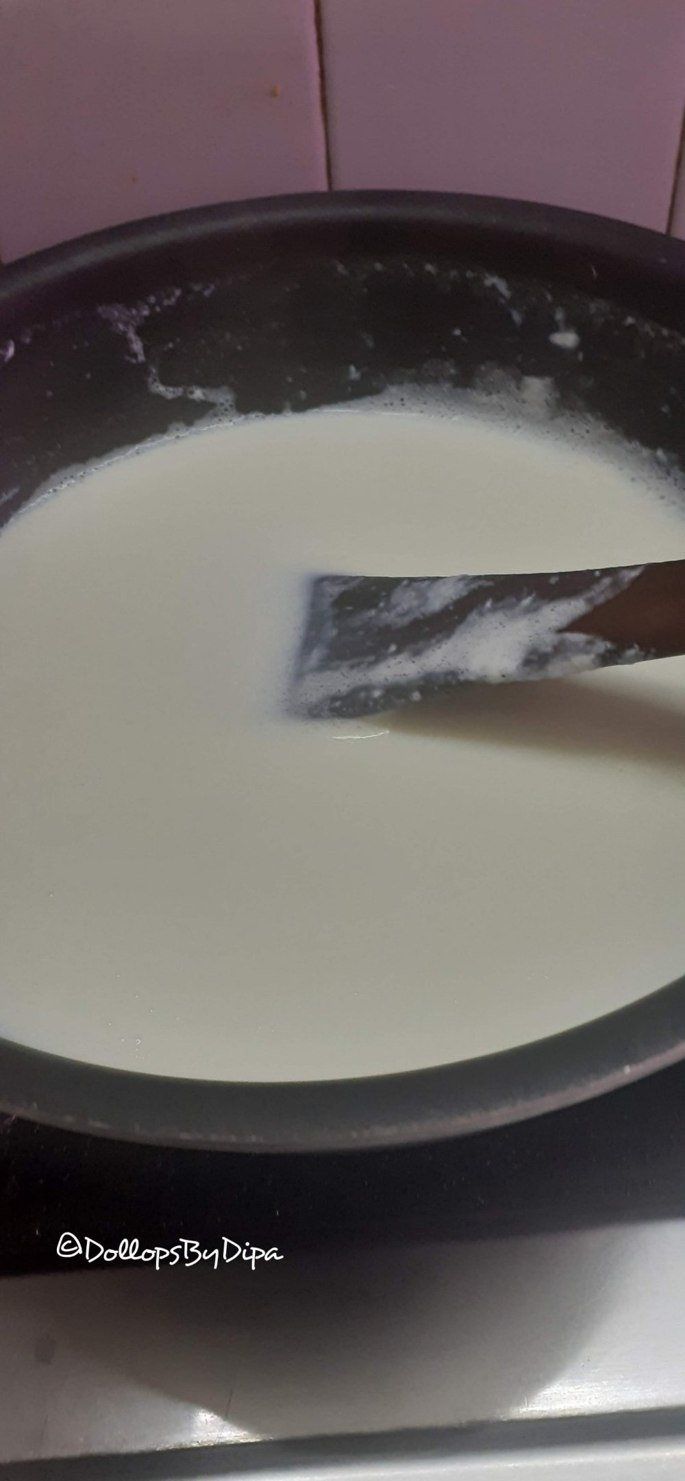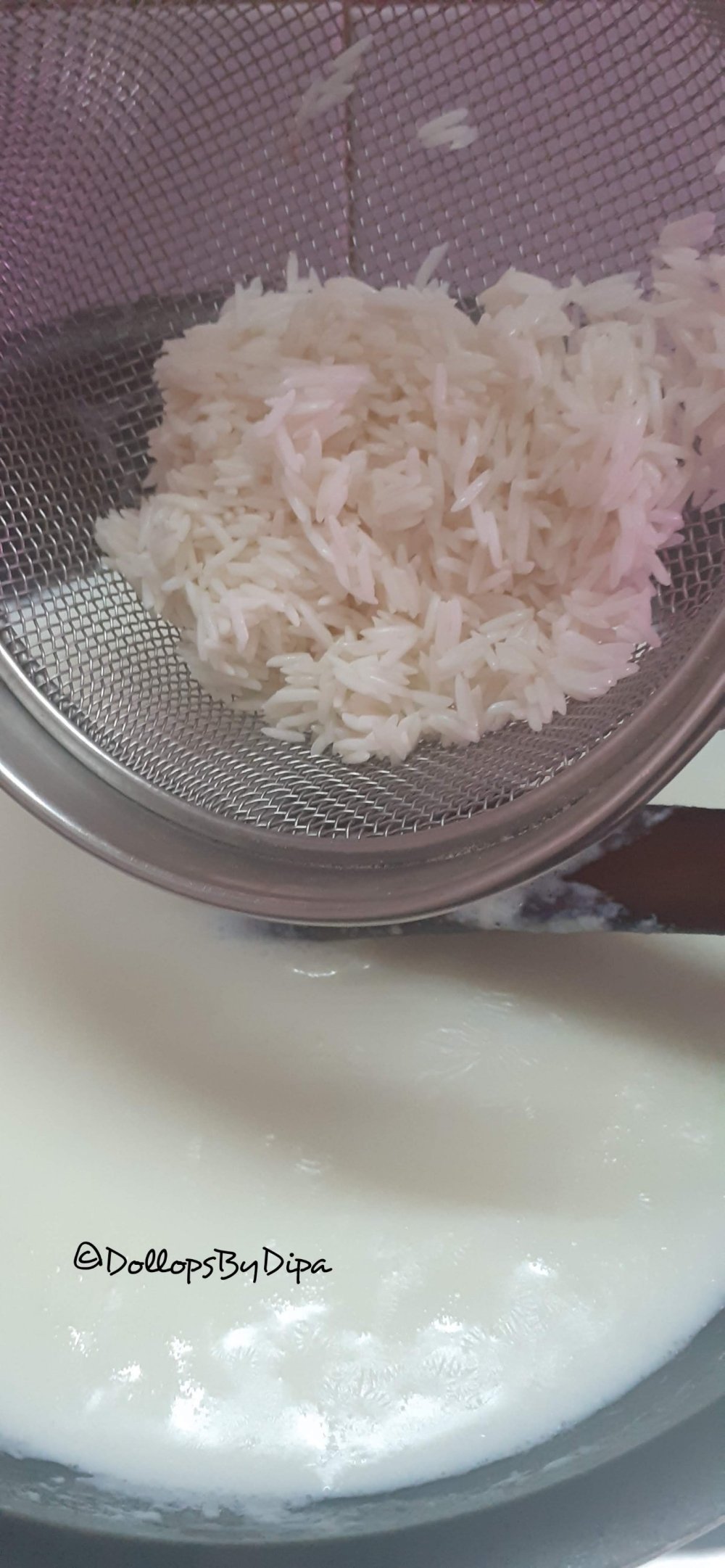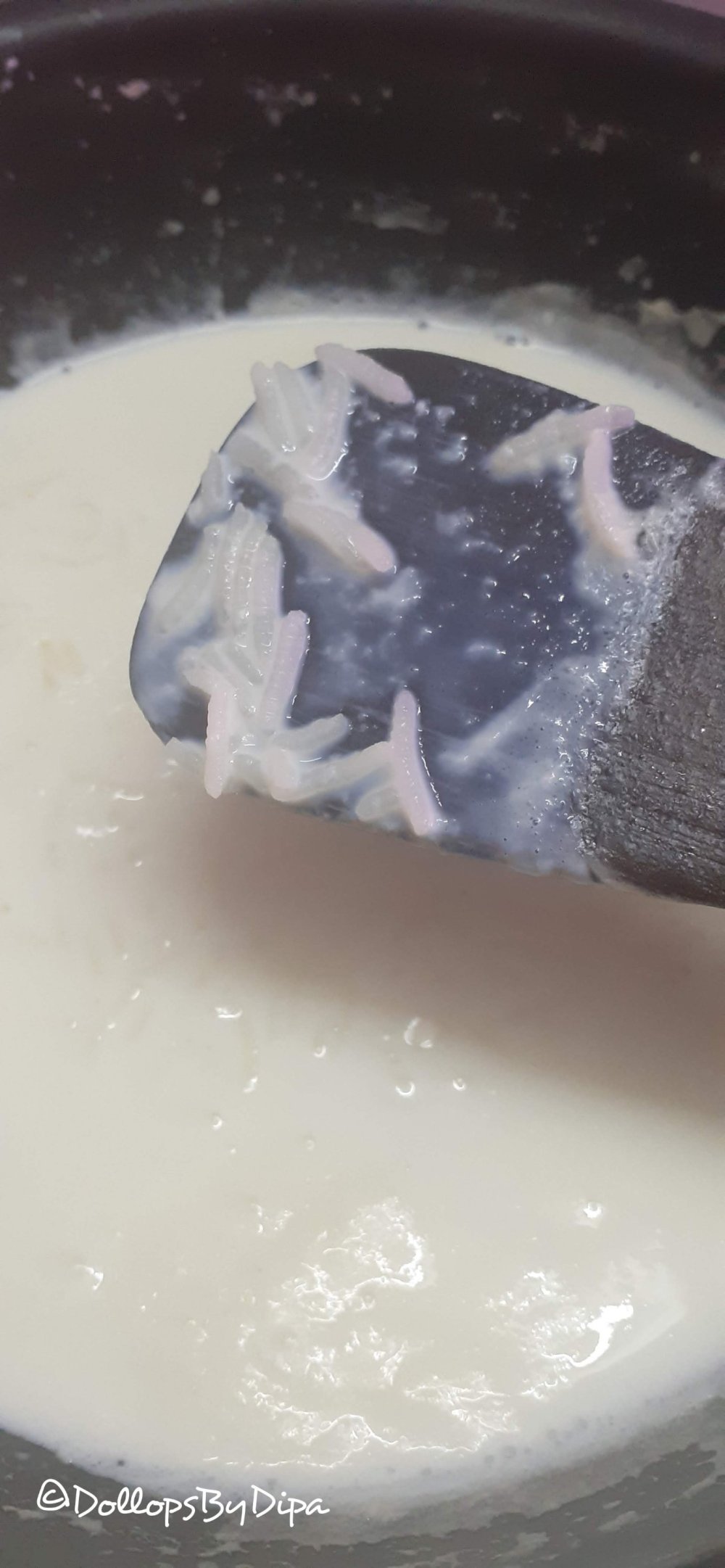 1. Add milk in a nonstick pan or thick bottom pan, turn on the heat. Spare 2 tbsp milk aside. Wash and soak rice for 15-20 minutes.