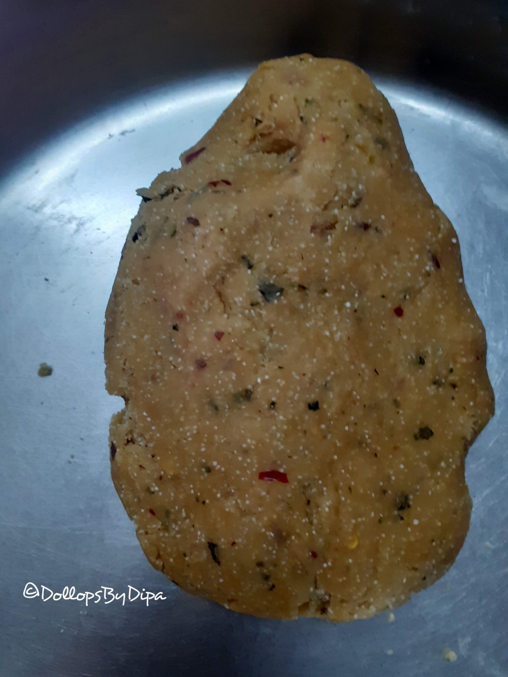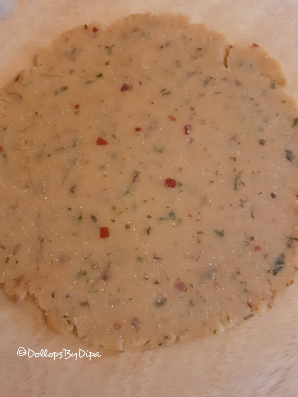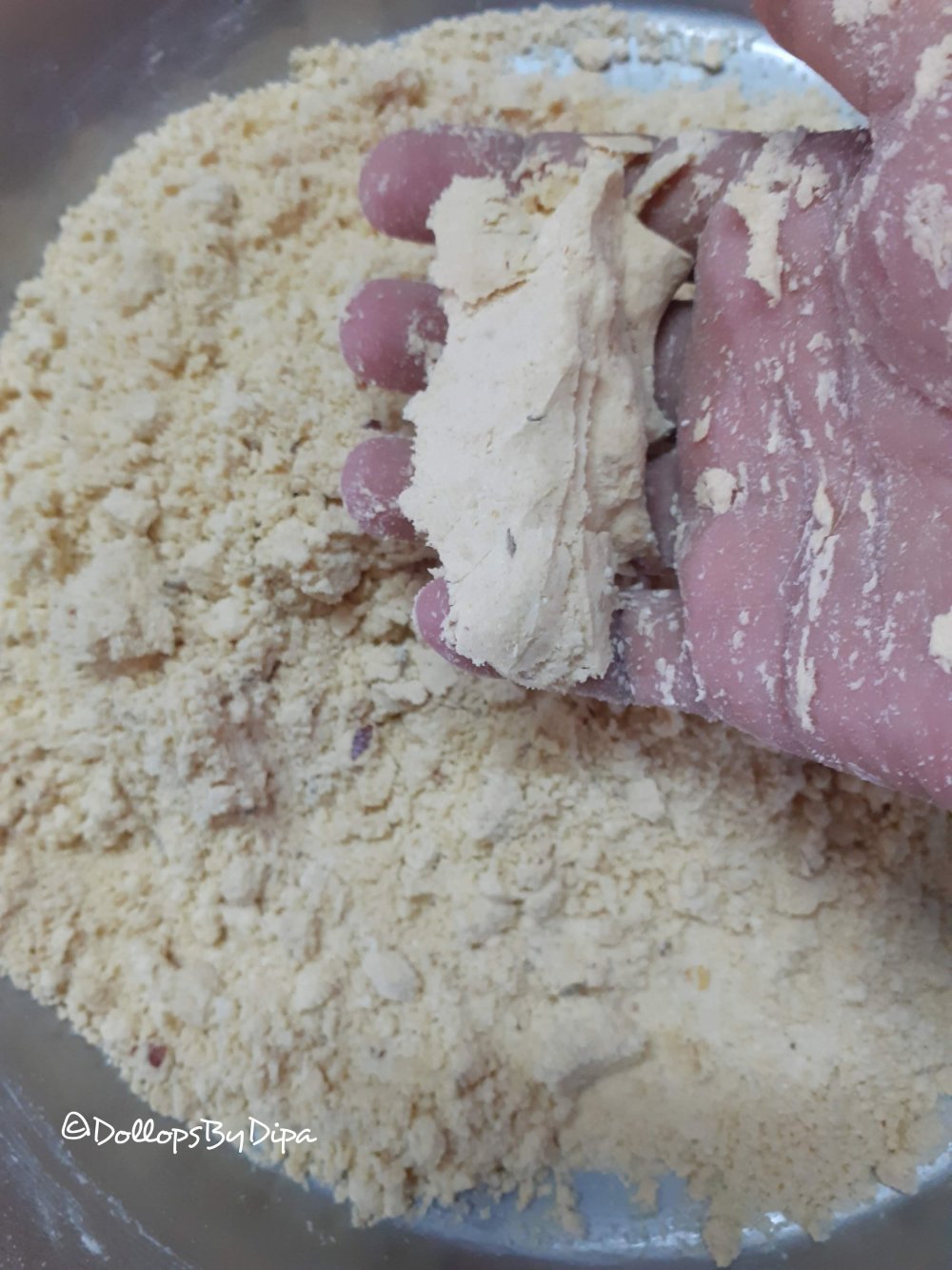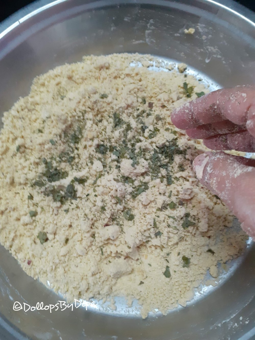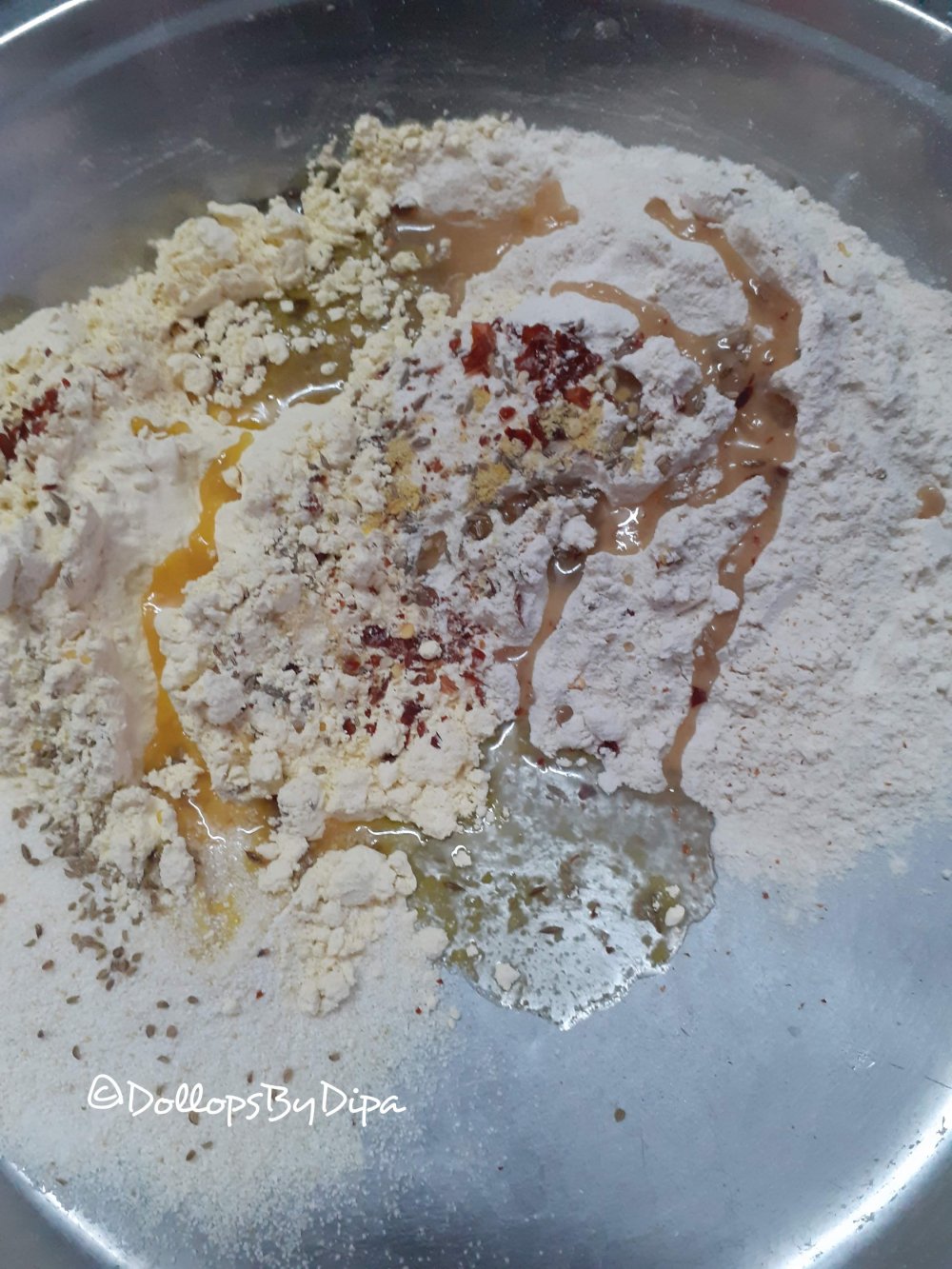 1. Mix all the flours and dried spices, salt and oil+ ghee and crumble it well.