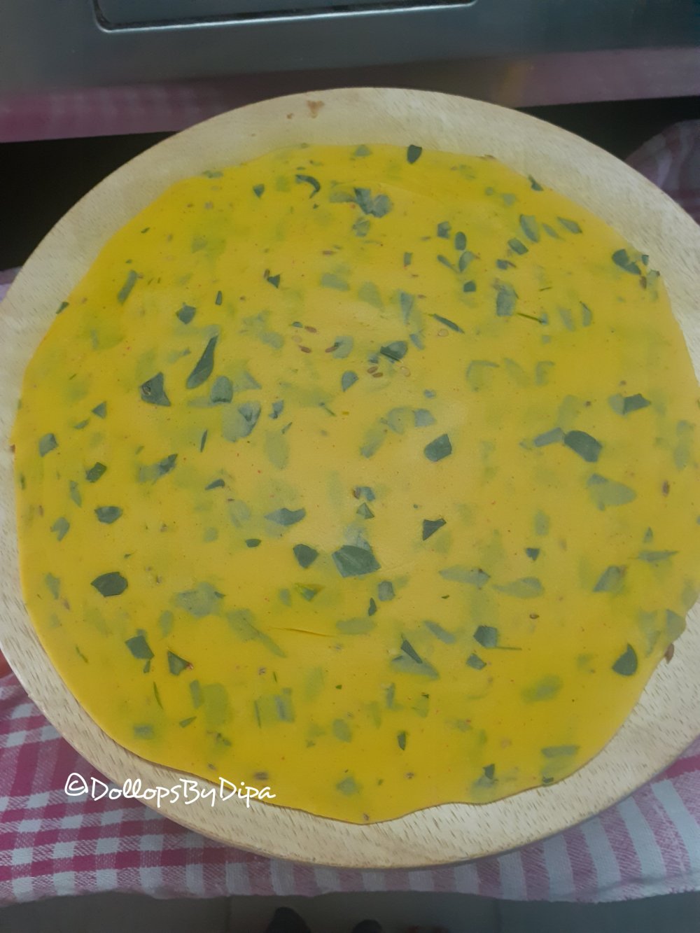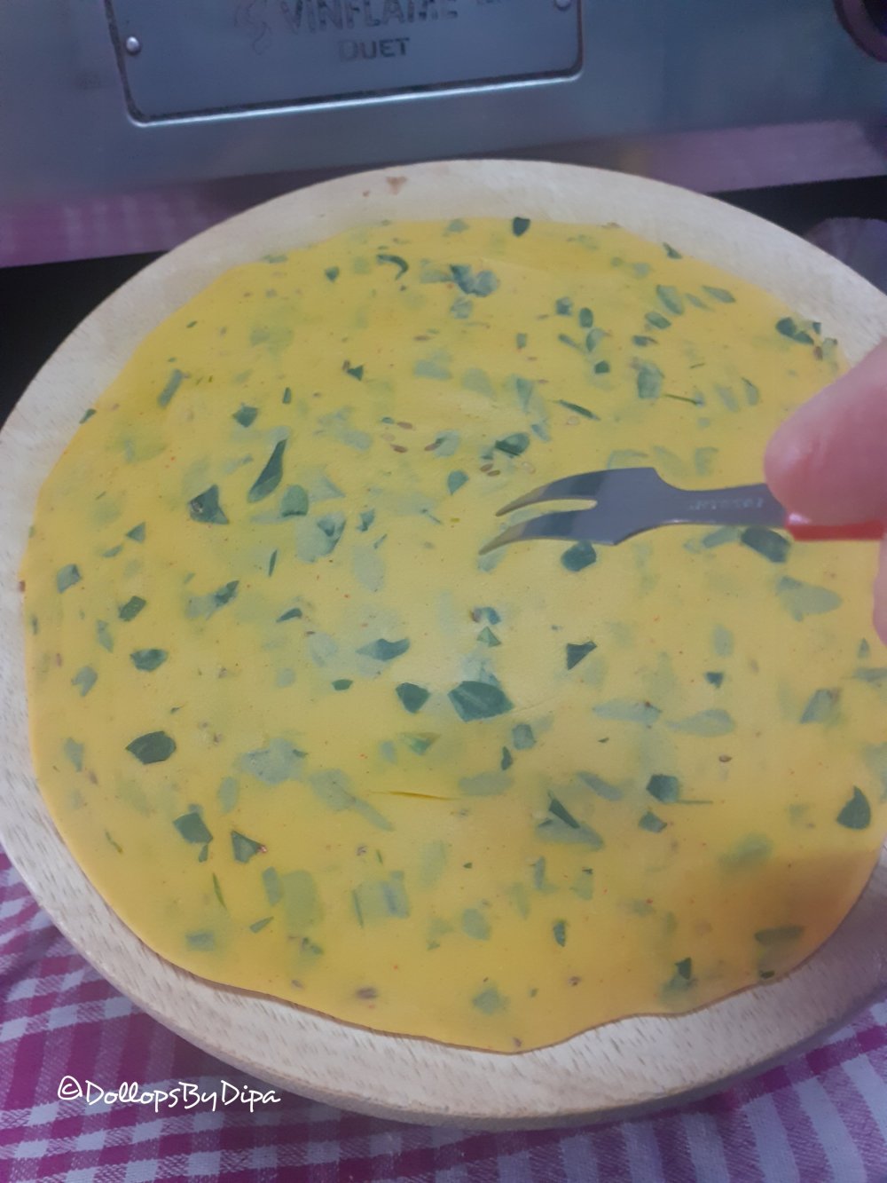 2. Divide the dough into equal parts. Take one and roll thin like roti. Use dry flour to roll easily and evenly.