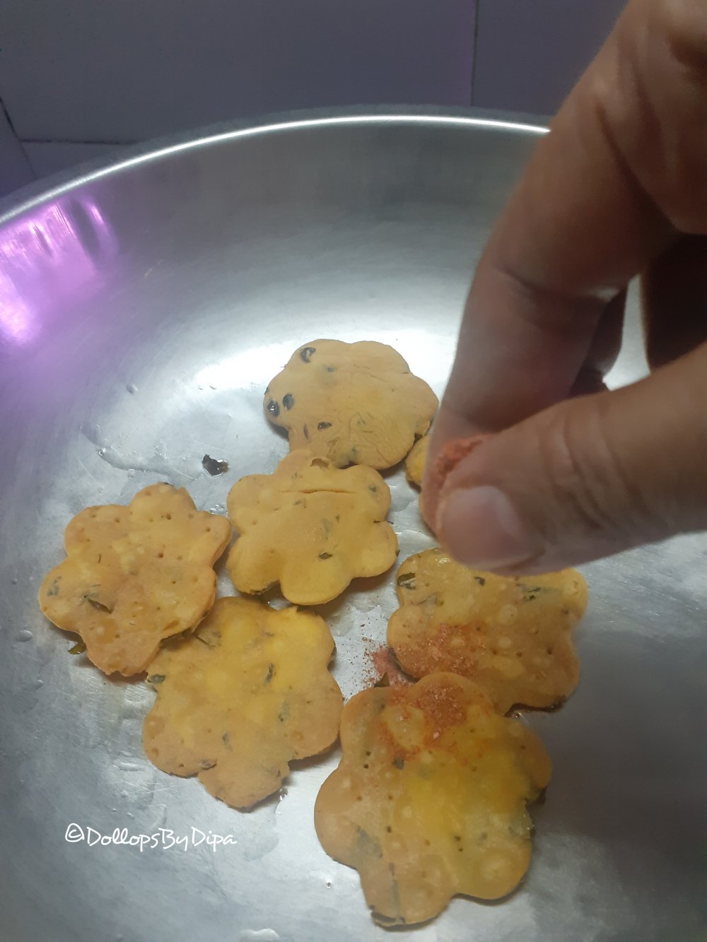 6. Mix both sprinkle spices and sprinkle it on fried mathris.