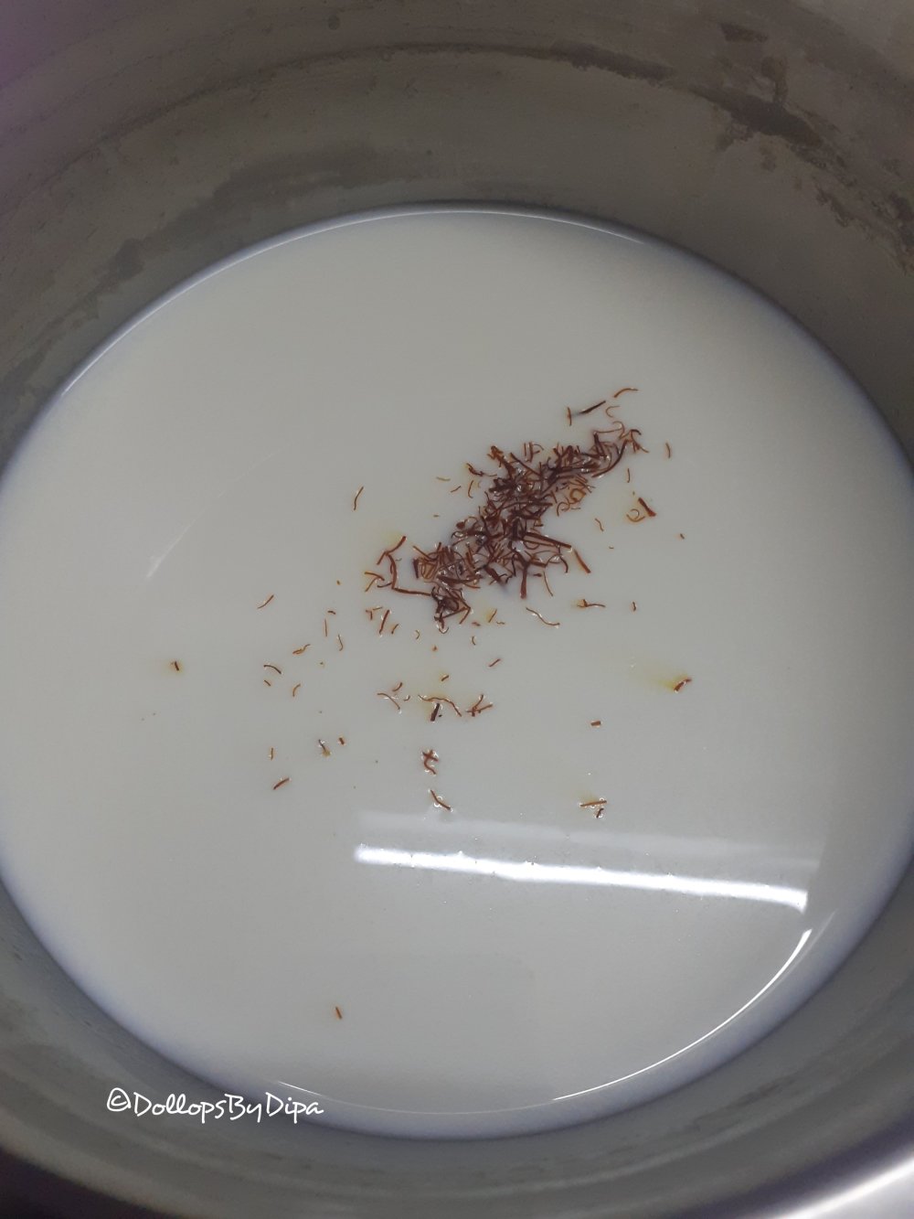 1. Spare half cup milk and add saffron in rest of the milk and let it boil, after one boil turn the flame on slow.
