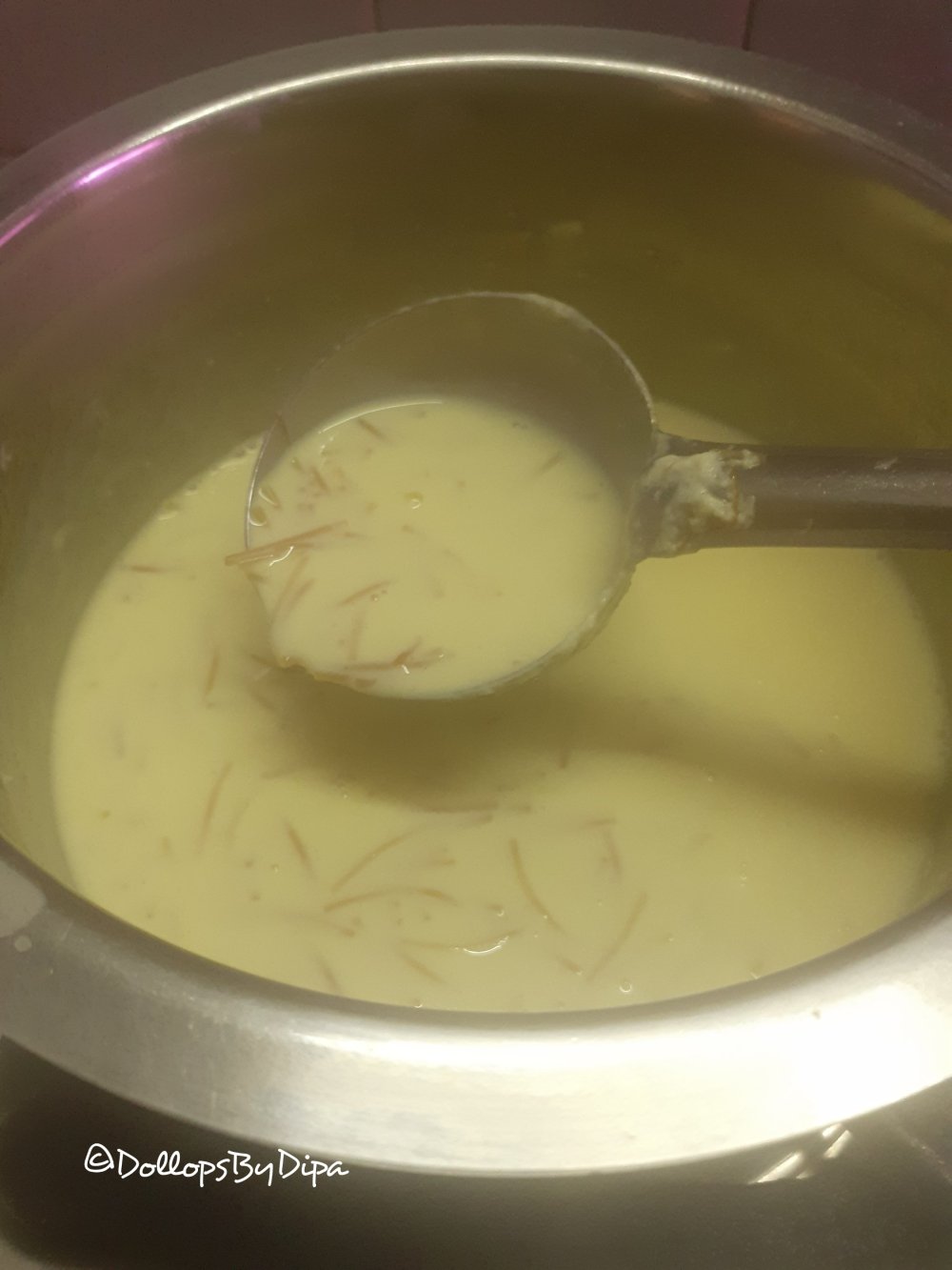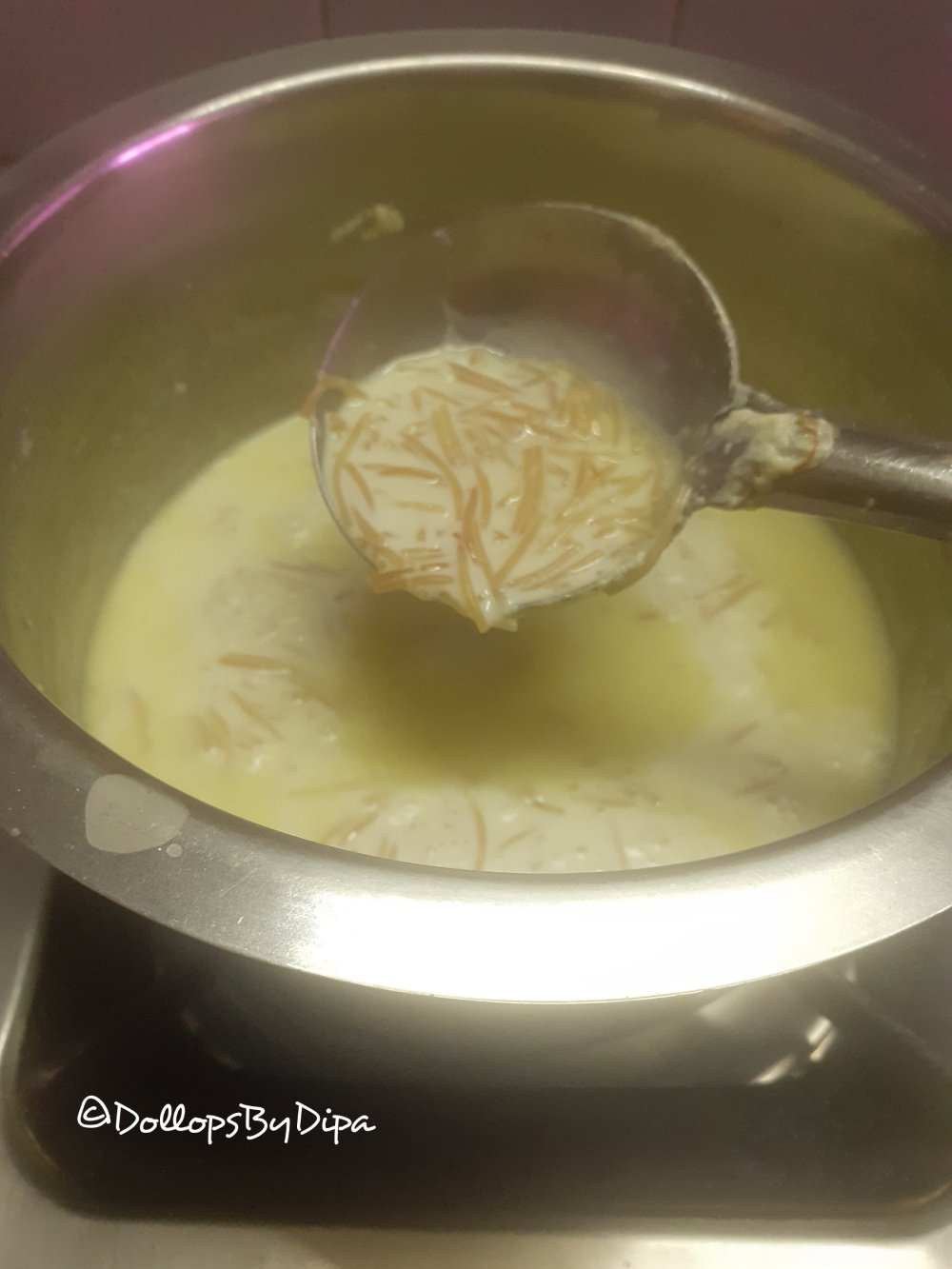3. After few minutes of simmering, milk starts thickening, add roasted vermicelli, mix and cook for 5-7 more minutes so they cook properly.