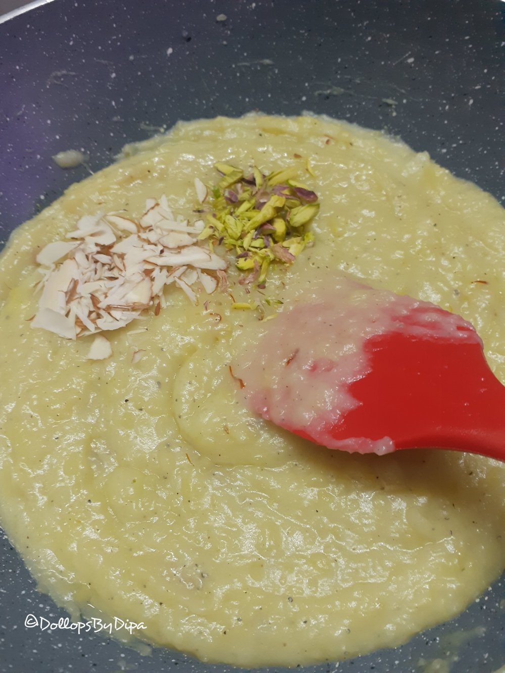 5. Again cook for 4-5 minutes on a low flame, add almond and pistachio flakes.
