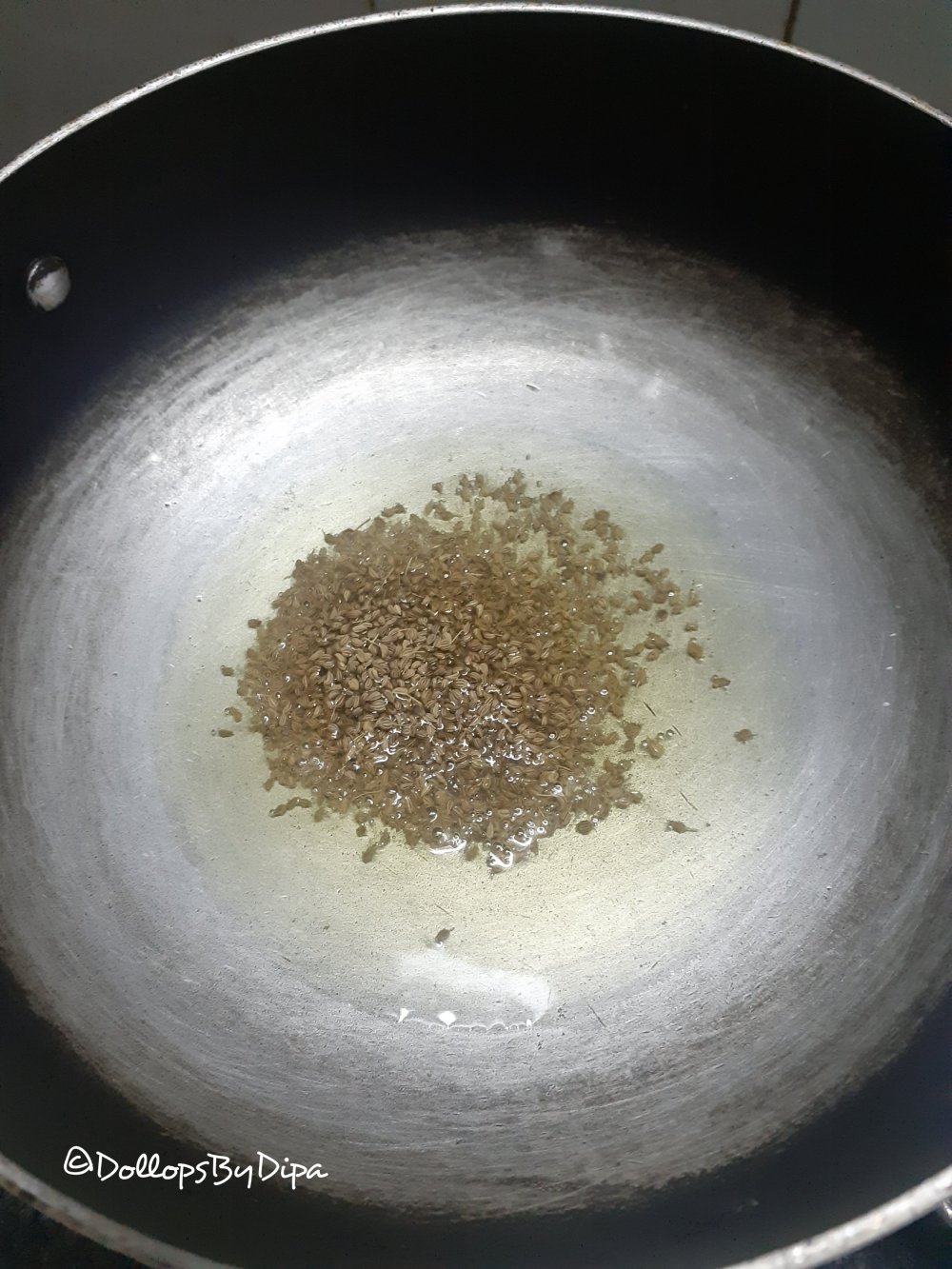 1. Heat ghee and add carrom seeds and both the spice powders and stir for a few seconds.