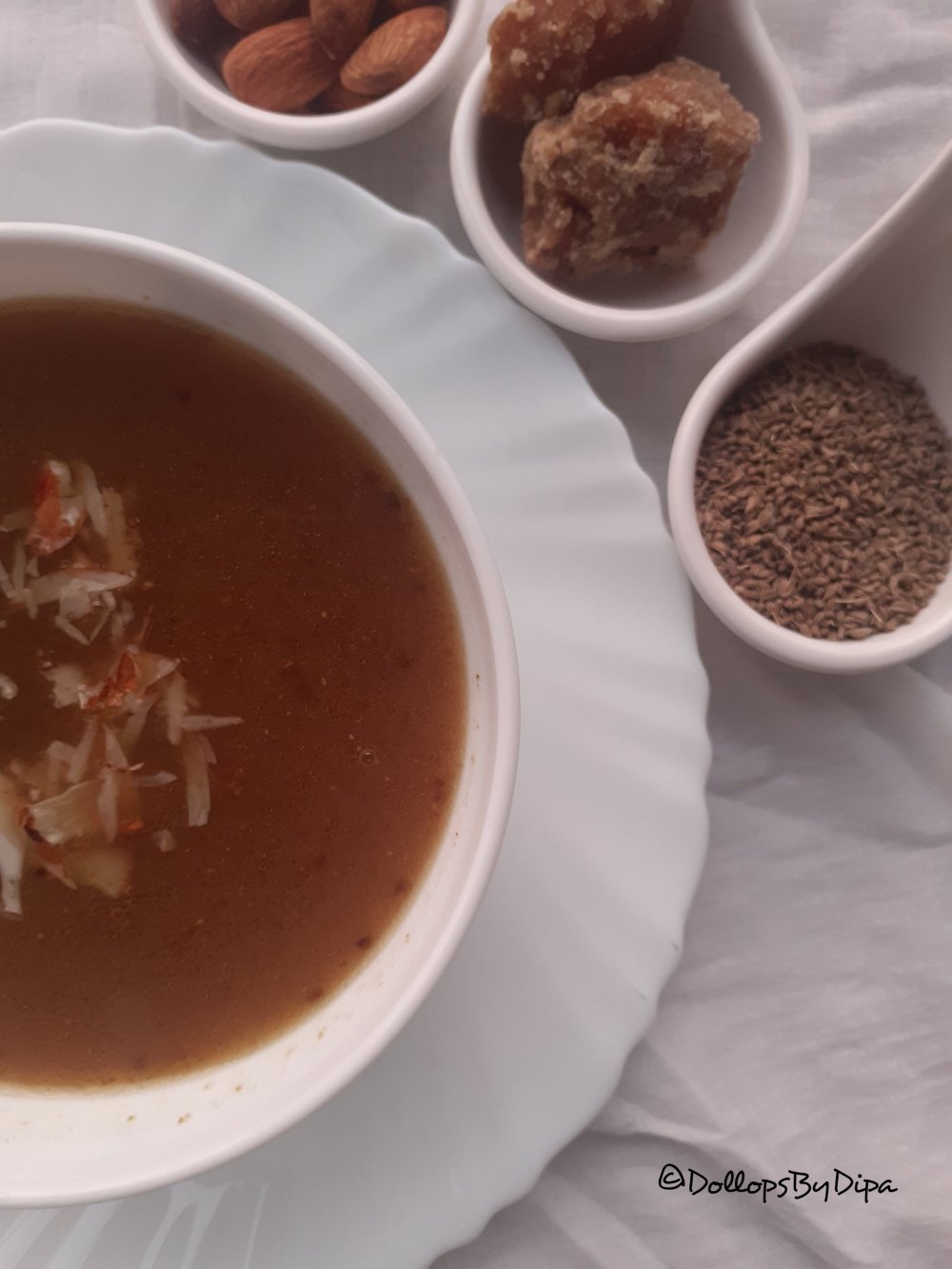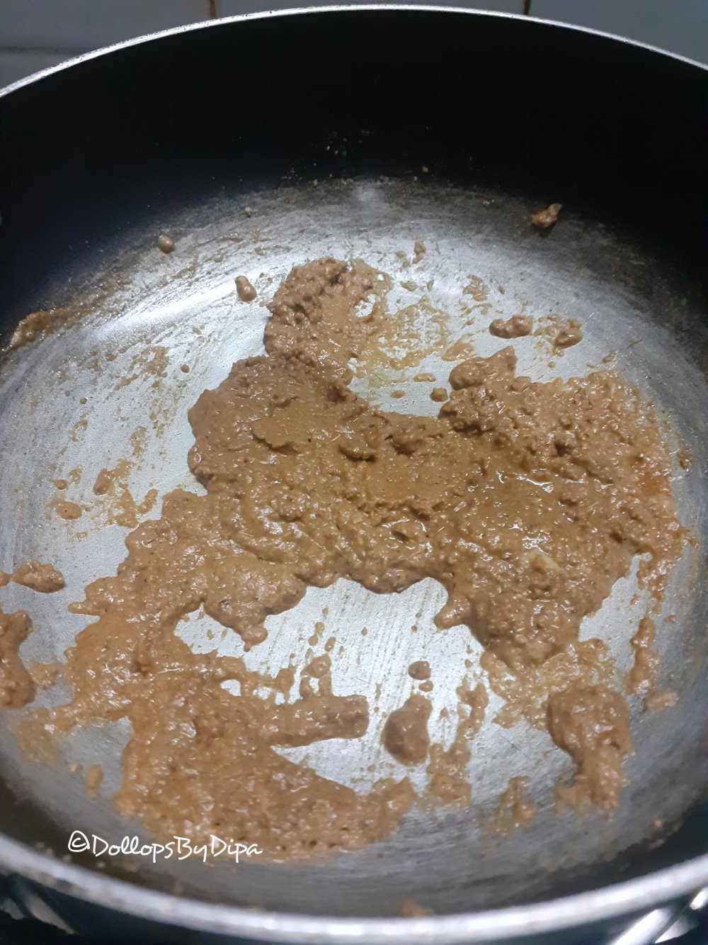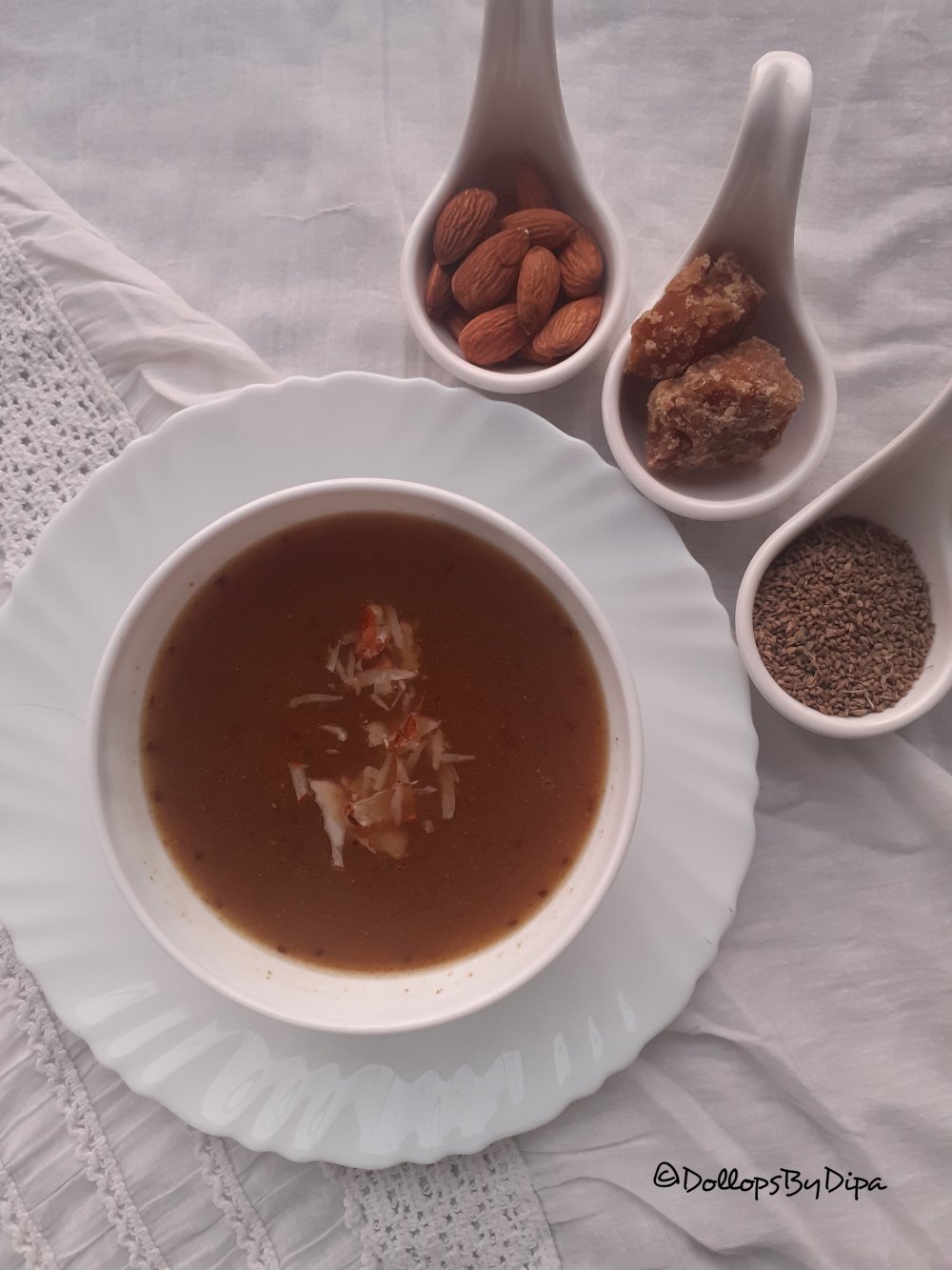 Raab can be prepared from various flours and also with edible gum. Here is a raab with wheat flour and carrom seeds.