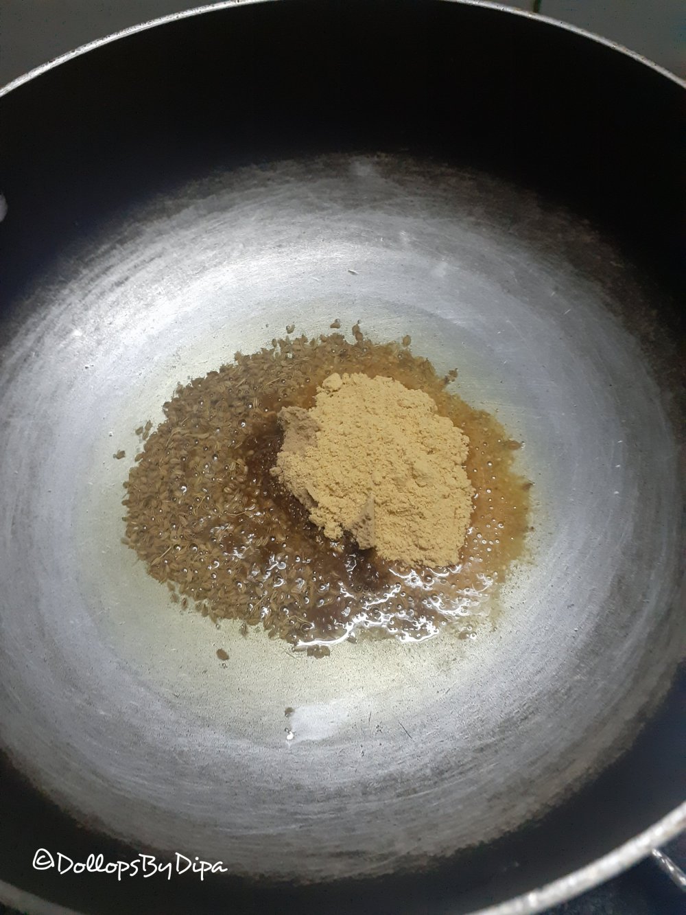 1. Heat ghee and add carrom seeds and both the spice powders and stir for a few seconds.