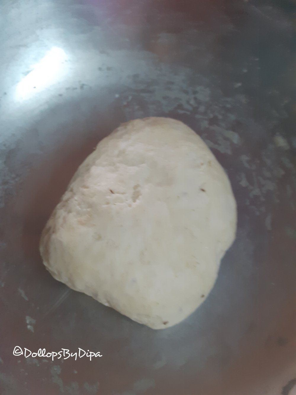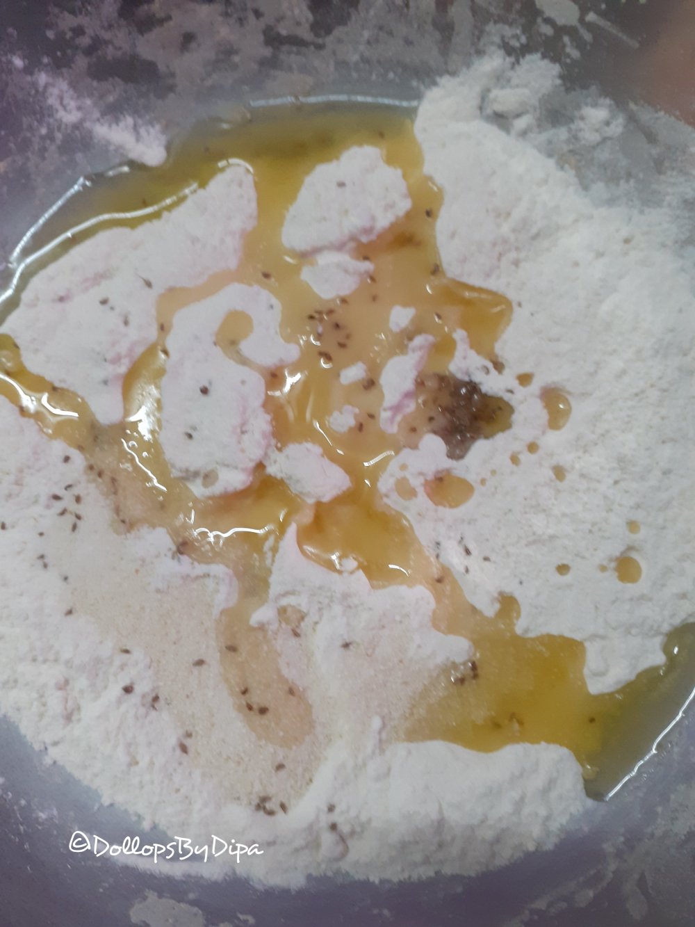 1. In a large broad vessel mix all the ingredients of dough and crumble well then add water and knead medium dough, cover and let it rest for 15-20 minutes.