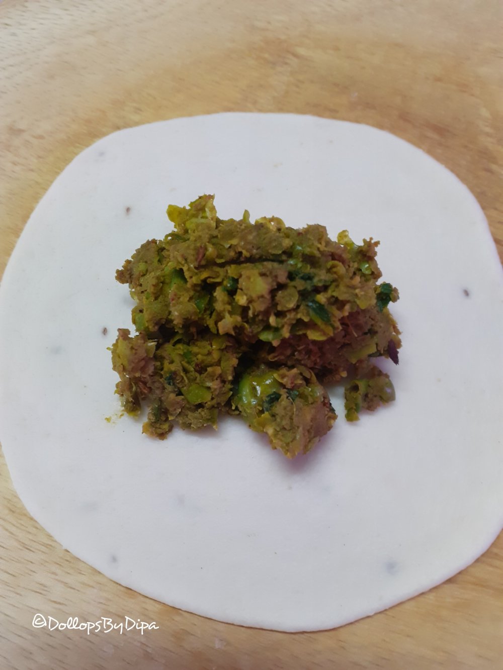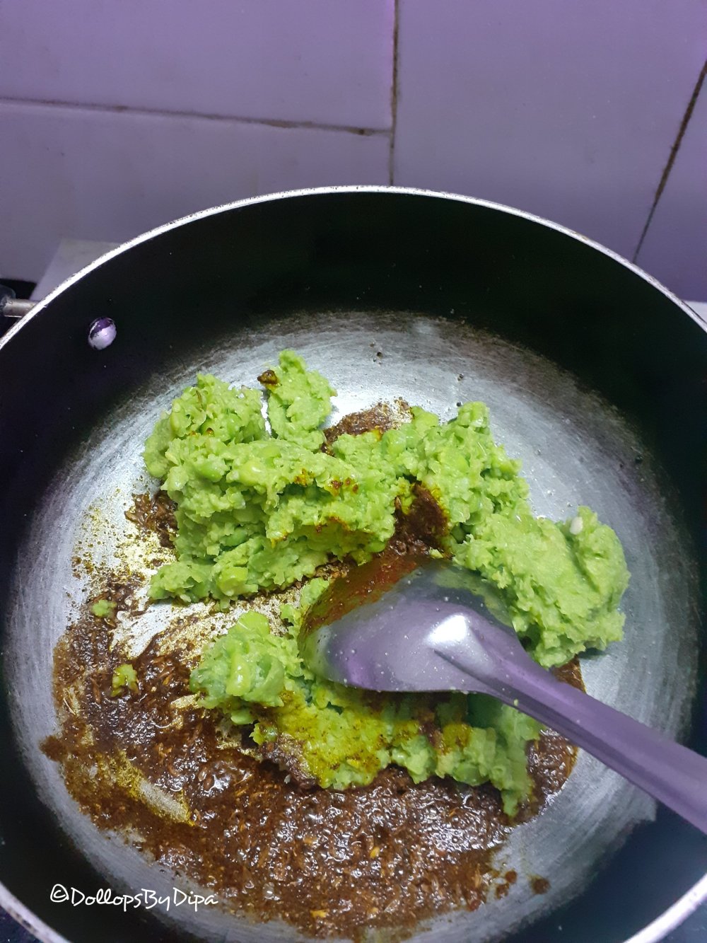 2. To prepare stuffing, firstly make coarse paste of green peas, green chillies and ginger.