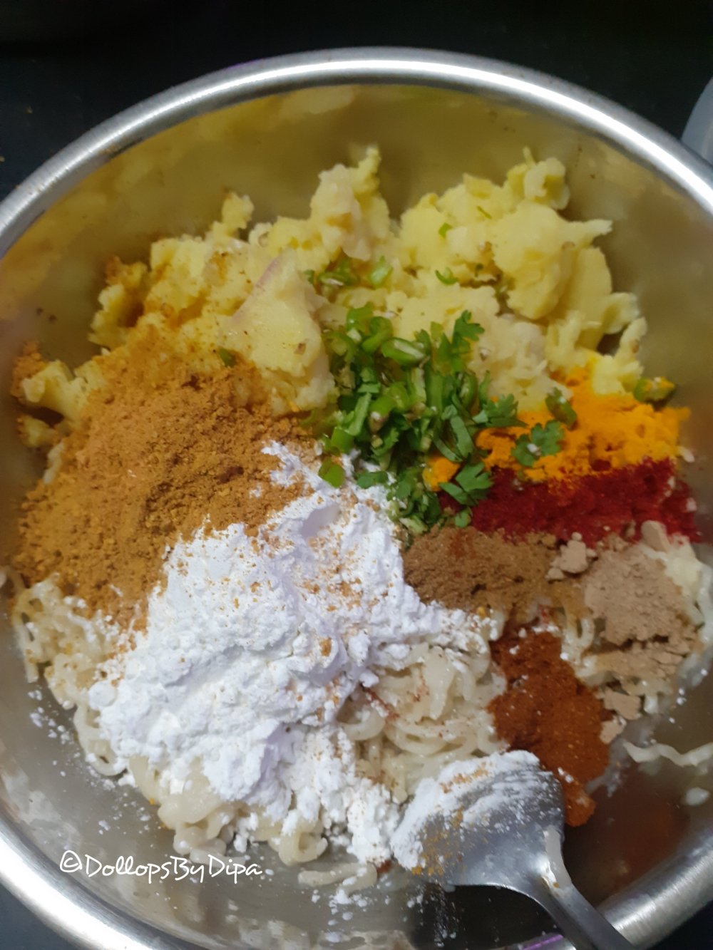2. Now in a big bowl, add maggi, mashed potatoes, corn flour and rest of all spices and green chillies. Mix properly.