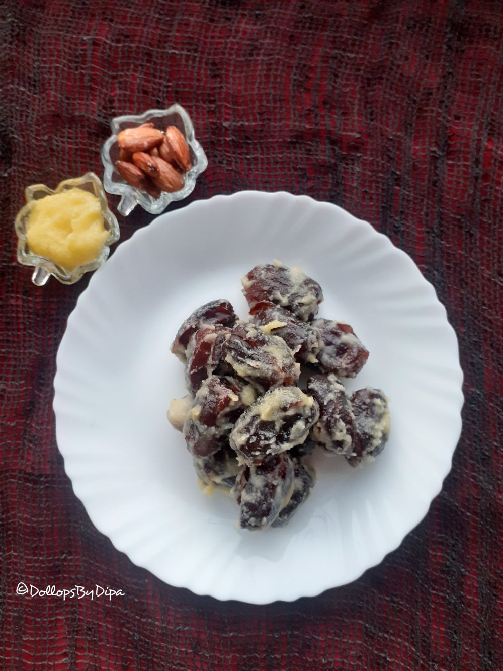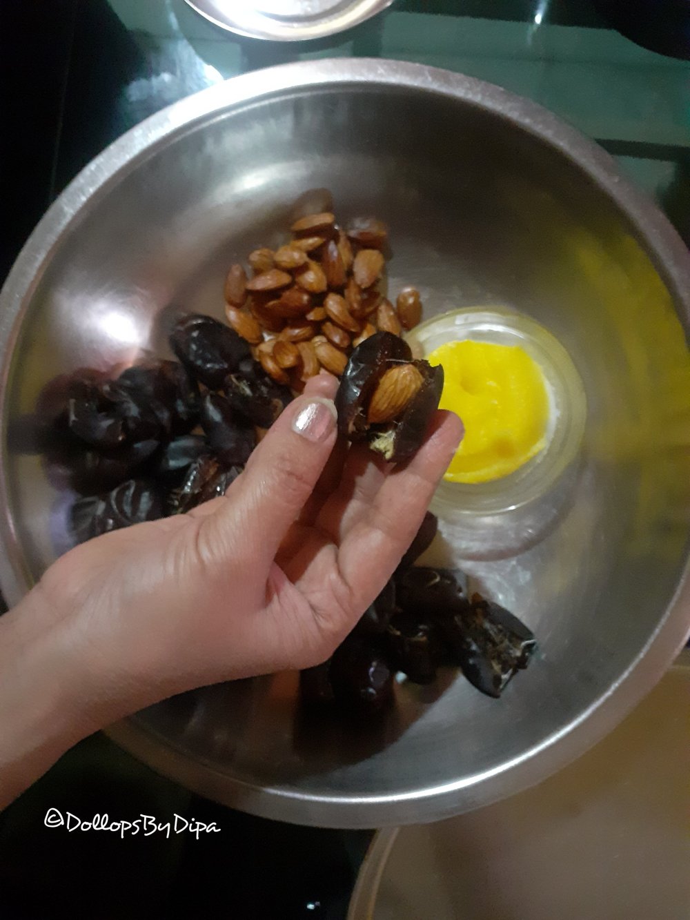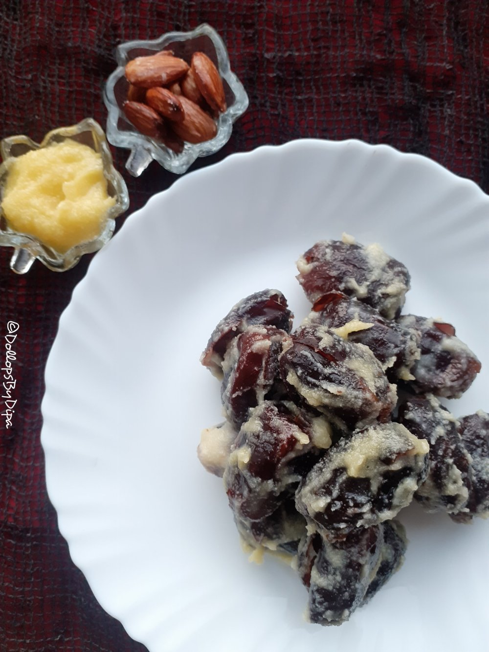 Here is a winter special – almond stuffed dates, dipped in calrified butter(ghee). One or two daily, gives you enough energy and inner body warmth and health in winters.