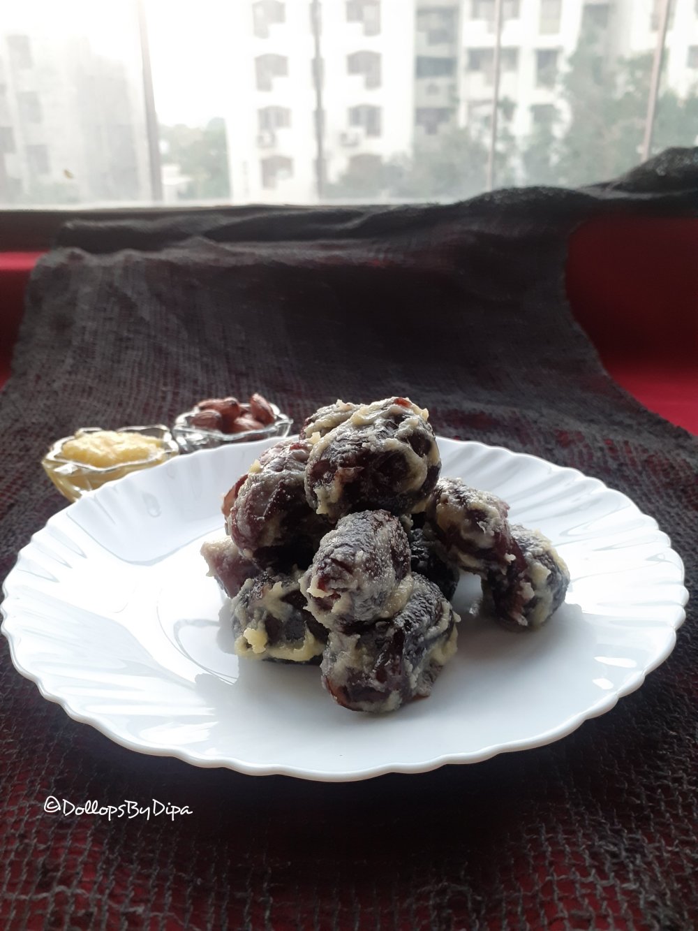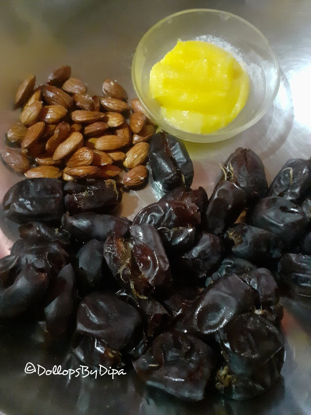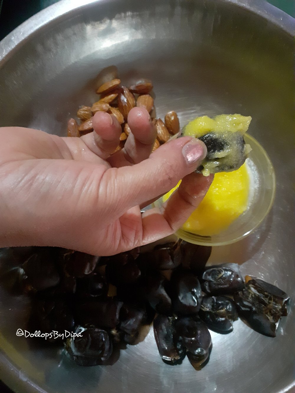 Here is a winter special – almond stuffed dates, dipped in calrified butter(ghee). One or two daily, gives you enough energy and inner body warmth and health in winters.