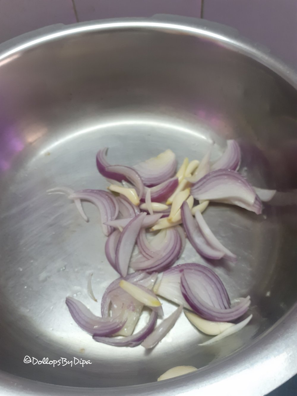 1. Heat oil in a pressure pan and sauté onion and garlic.