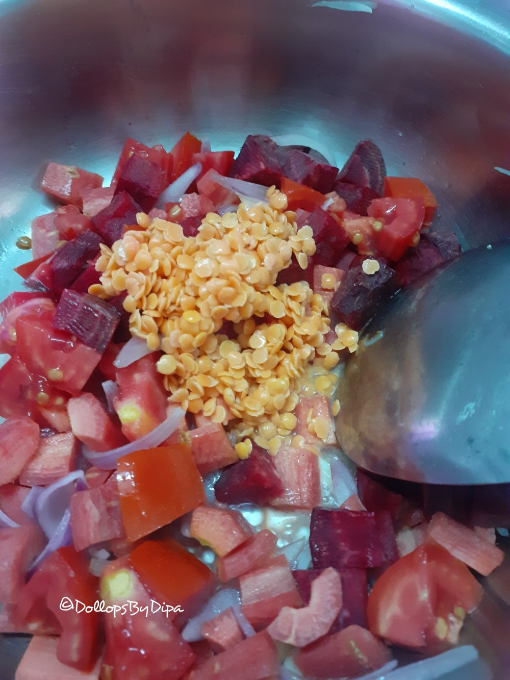 2. Add all the vegetable dices and washed dal and sauté for a while.