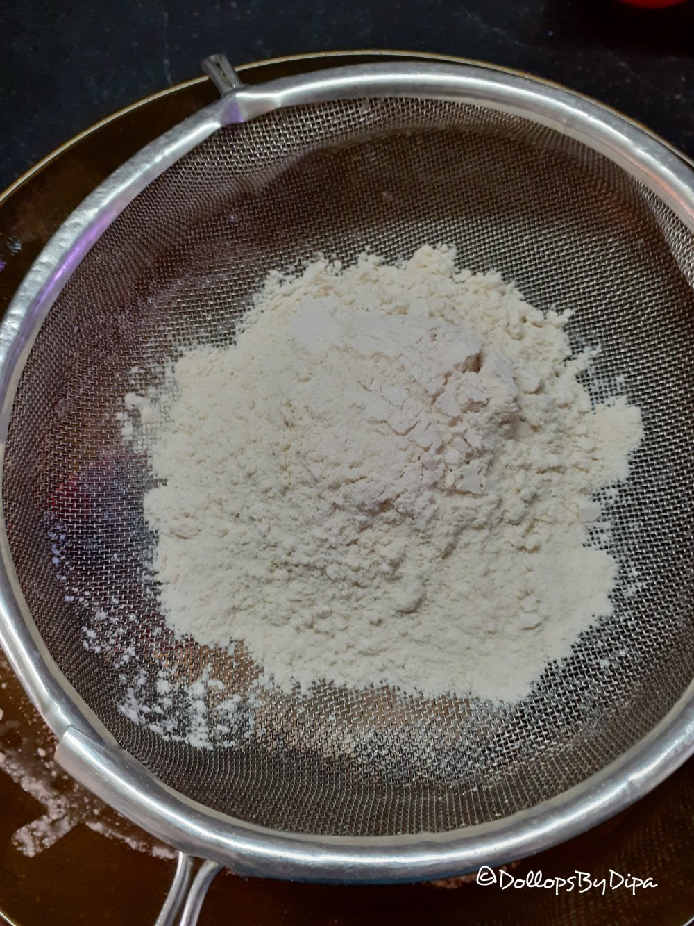 2. Then sieve the wheat flour and suagr in it, little by little.