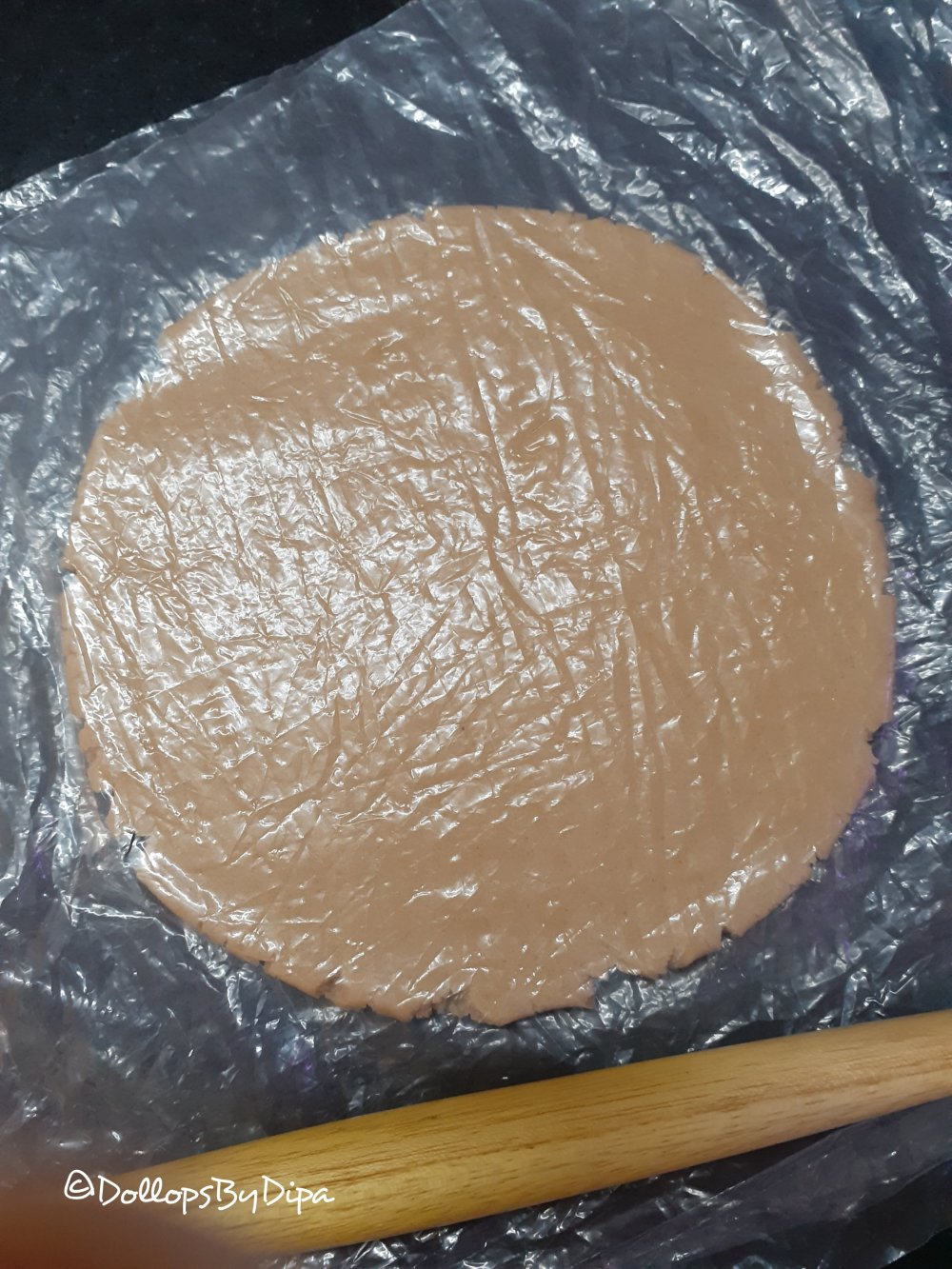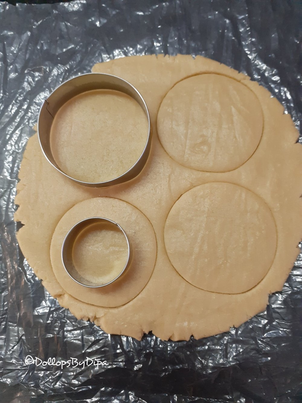 5. For glass cookie, take some dough between plastic sheet and roll it. Cut it into ring shape with 2 differnt sized cookie cutter.