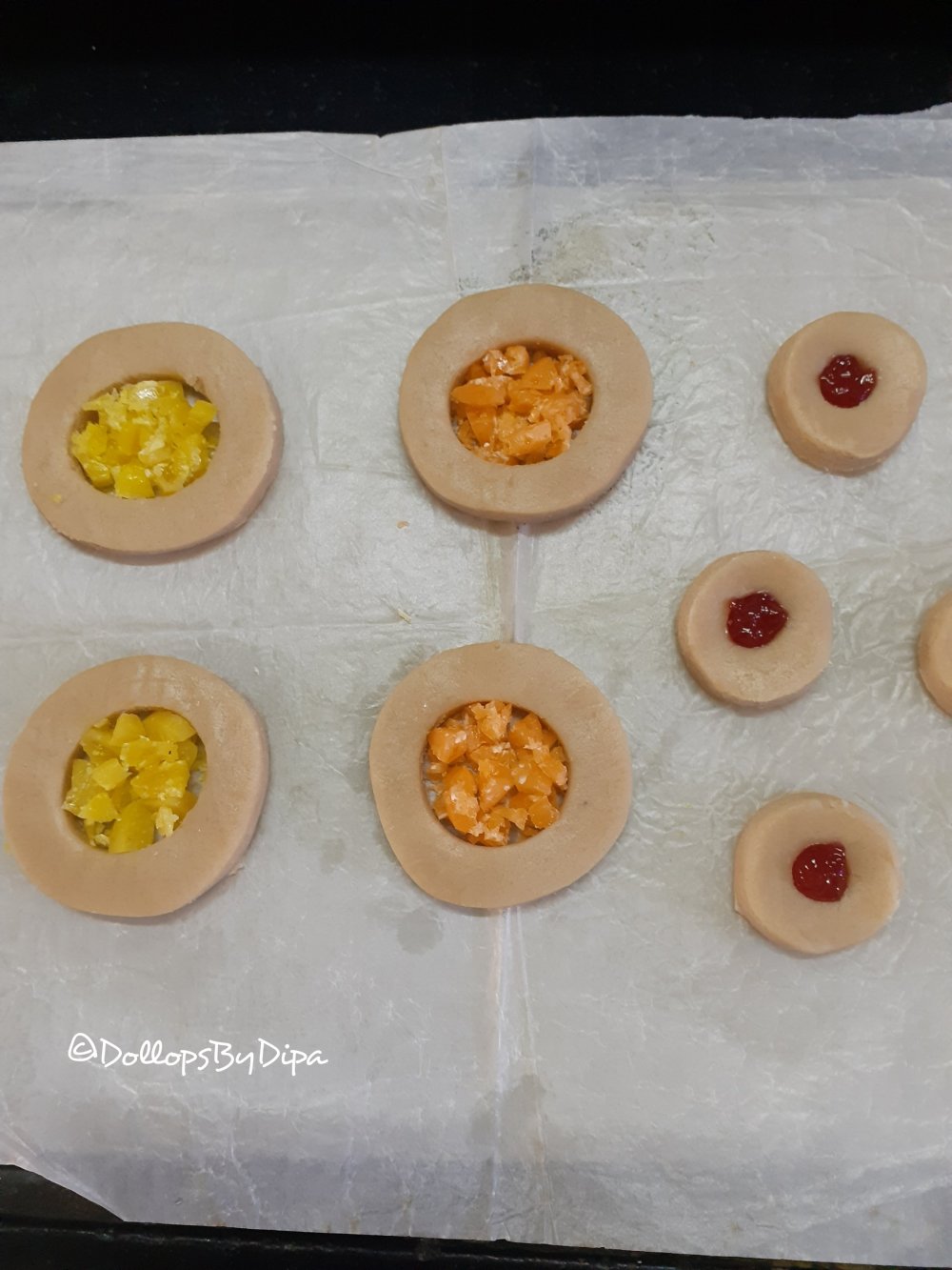 7. For jam filled cookies, use the small round centre cookies which got from making the ring cookies. Press it from centre so that we can fill jam in it. Whip the jam little and fill it in that cookie. Place it in the tray.