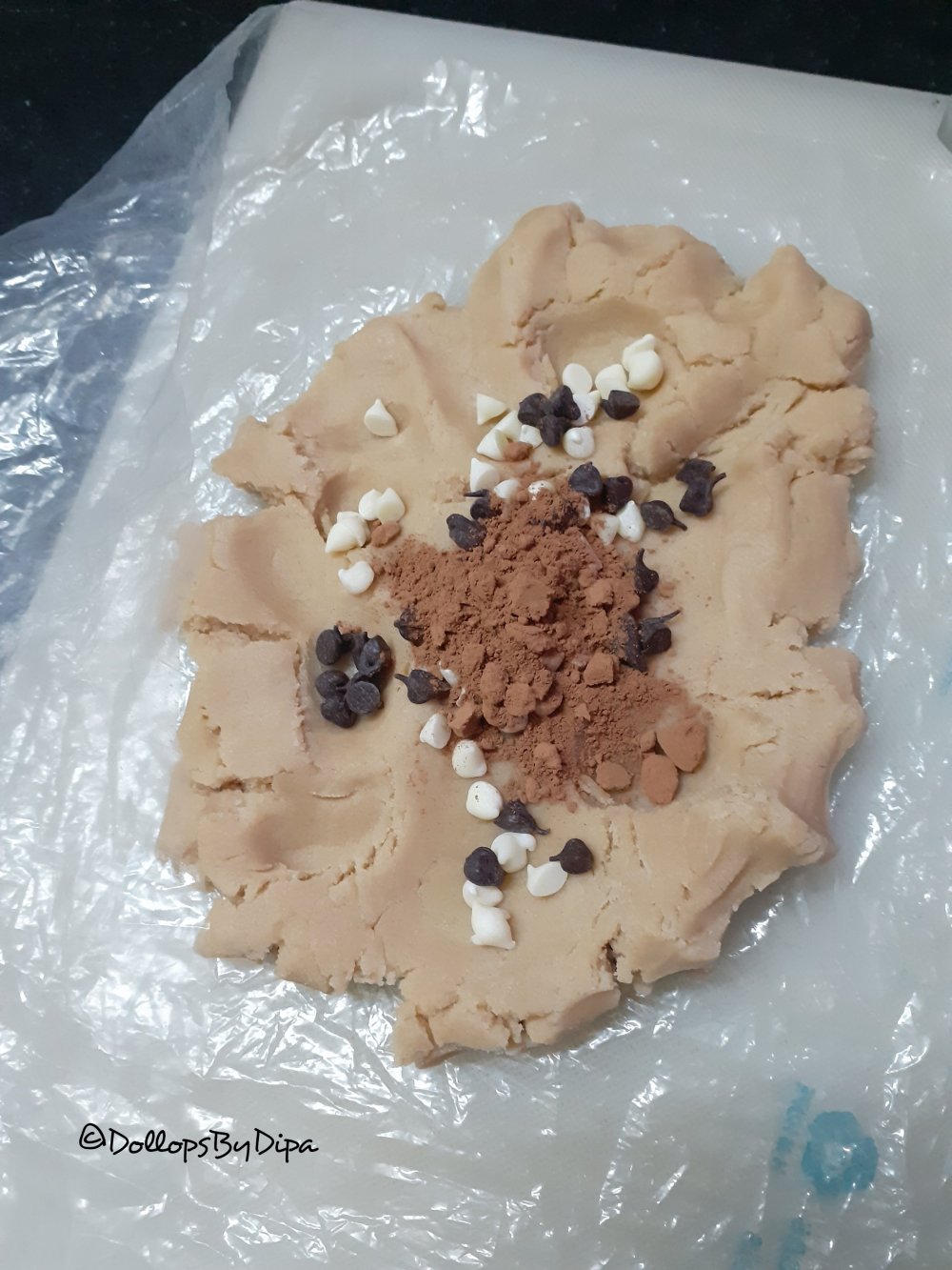 8. Take some cookie dough, add cocoa powder and choco chips and roughly mix so that we get shades and marble effect in our cookie. Prepare cookie and top it up with some chocolate chips.