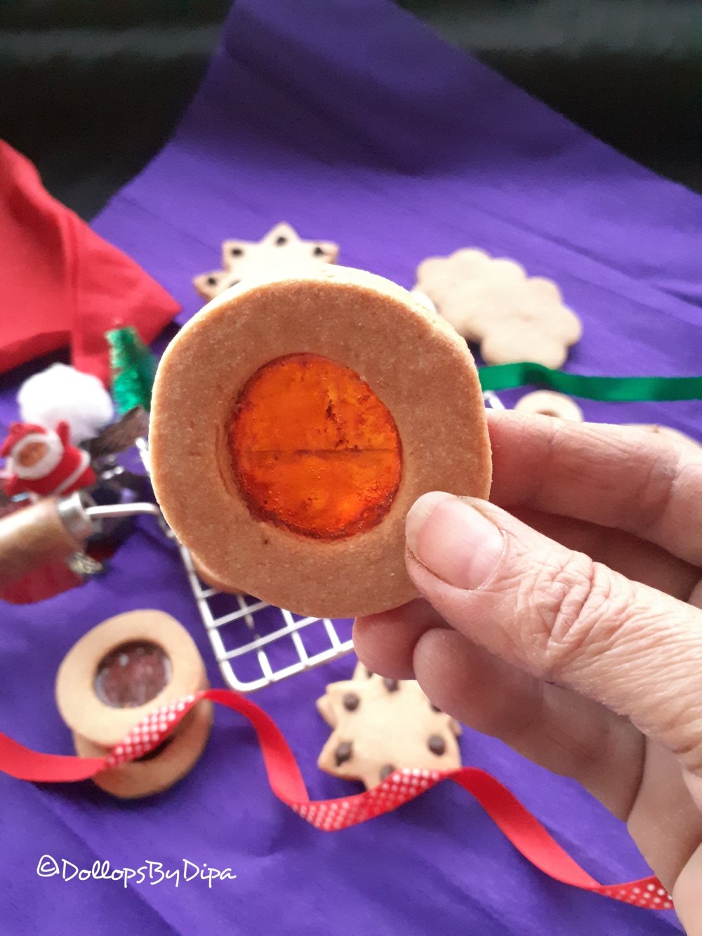 6. Line the baking tray with parchment paper. Place this ring shapes cookie in it. Fill the centre part with crushed candies.
