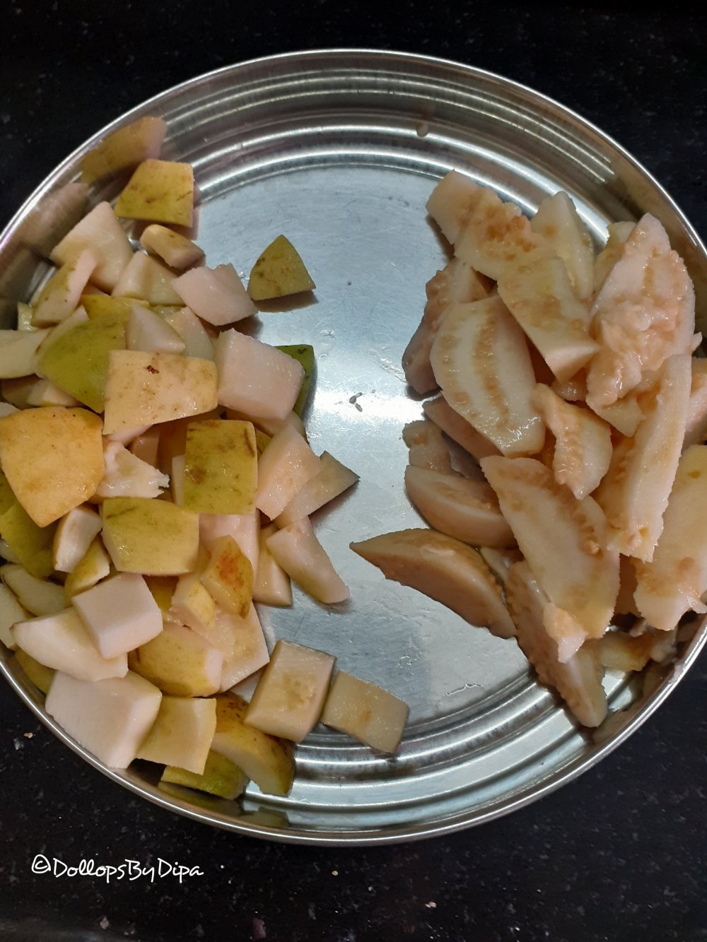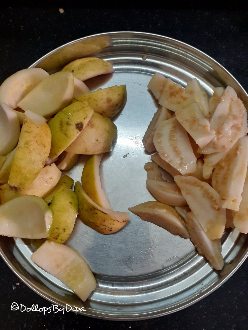1. Wash guava and cut it into 4 or 8 parts. Scoop out the centre part with seeds and then chop rest of guavas.