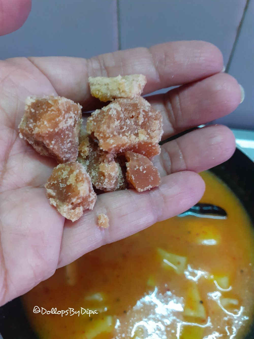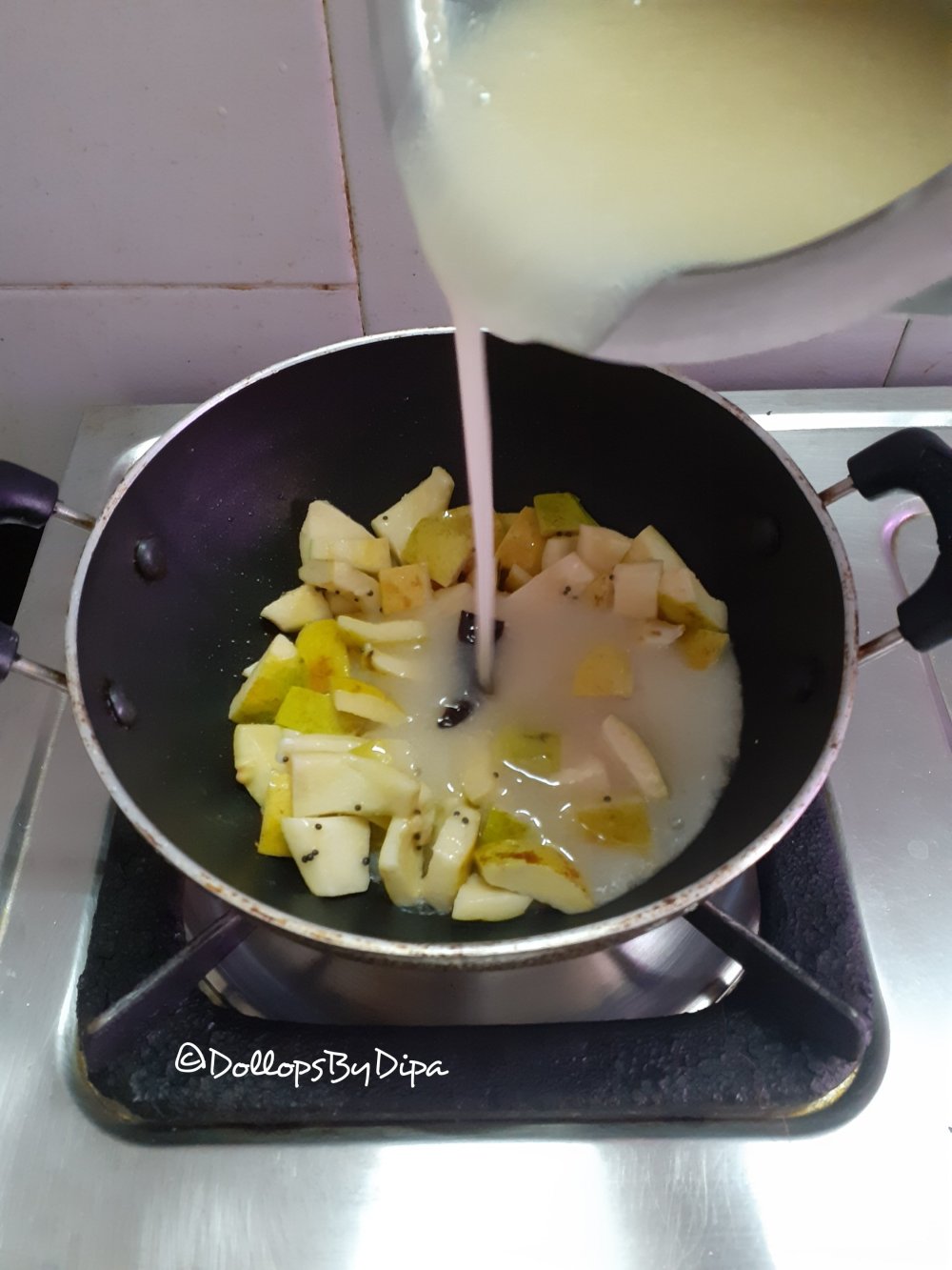 6. Add jaggery and if needed add 1/4-1/2 cup of water. Cover and let it cook for 5-7 minutes or till the guava is cooked properly.