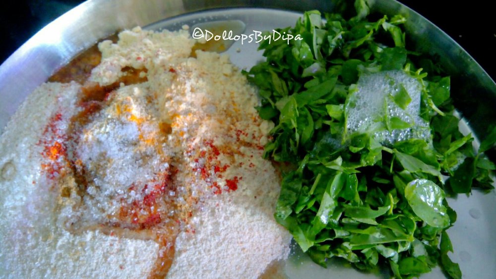 1. Add all spices, gram flour and oil in coarse wheat flour and mix well. Add cooking soda in chopped fenugreek leaves and pour lemon juice over it, bubbling occurs. Then mix it well. Add this to the flour mix and knead medium dough by adding a little water.