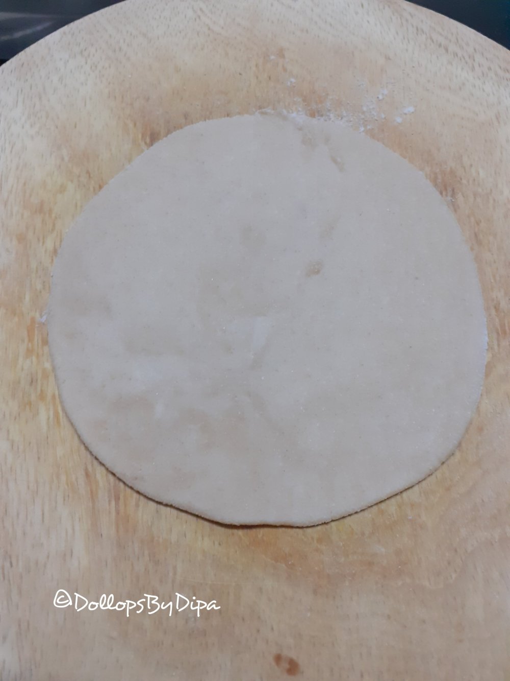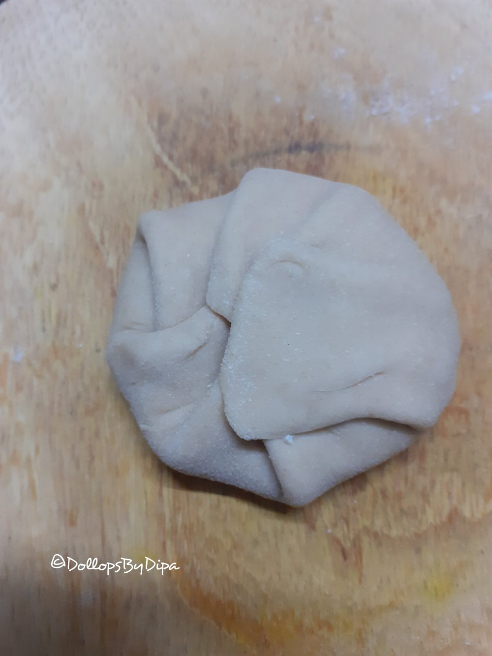 12. Gather all the sides and stick to centre. Pinch out extra dough from centre, if any.