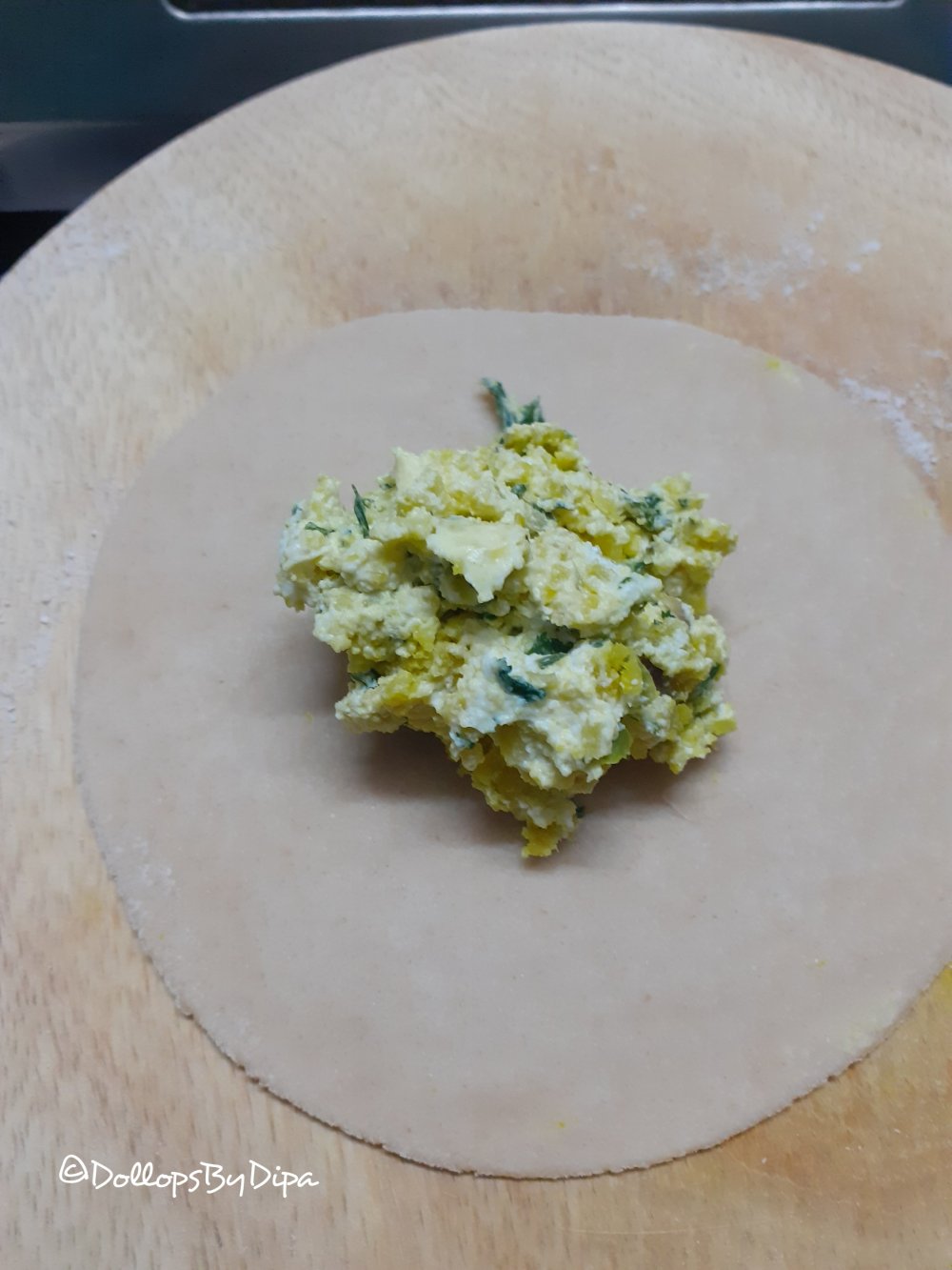 11. Take one, roll it little, put spoonful of stuffing in centre.