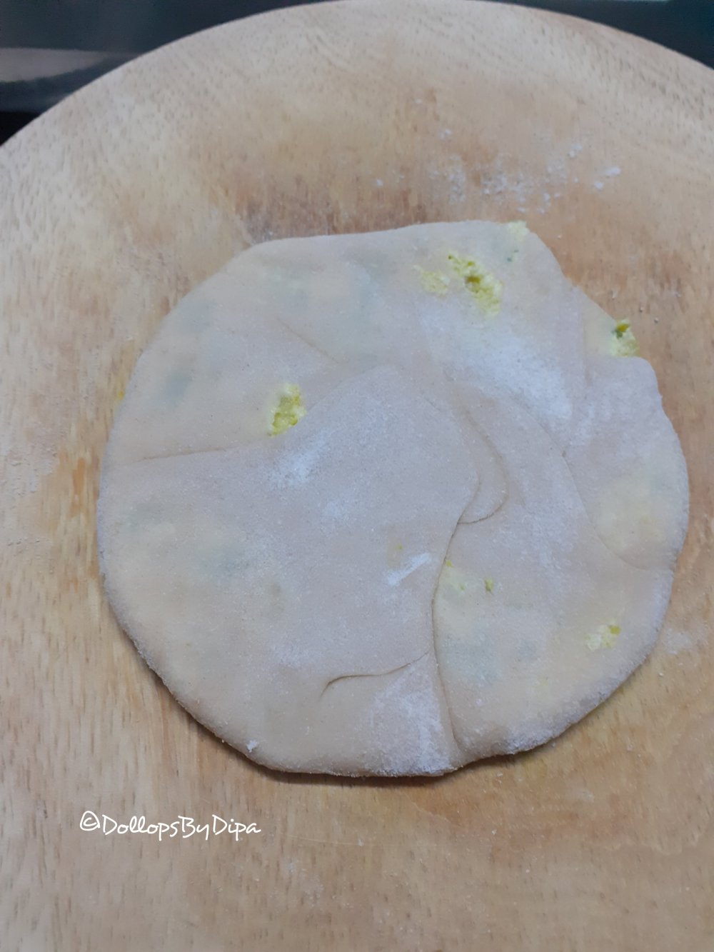 12. Gather all the sides and stick to centre. Pinch out extra dough from centre, if any.