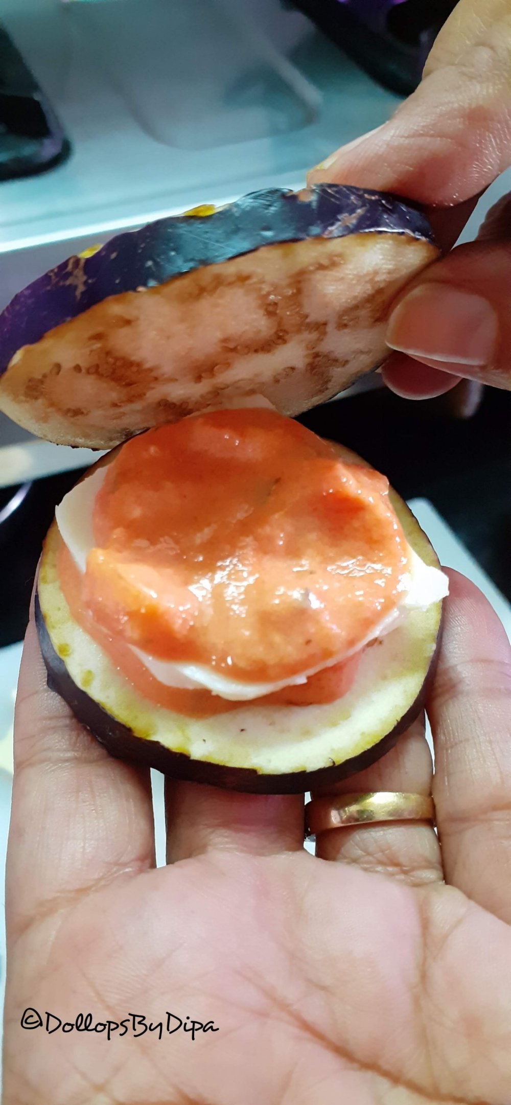 3. Now apply tomato cream sauce on one slice of brinjal, then arrange cheese slice on it and cover it with second brinjal slice. Now dip this prepared brinjal sandwich in the slurry and roll into prepared bread crumbs and press it with hands ,so it is covered properly with breadcrumbs. Continue with the rest of brinjal slices.