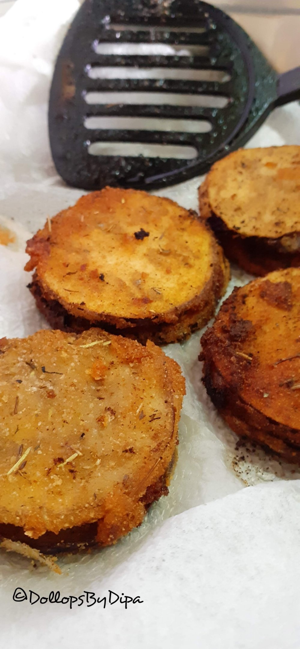 2. Prepare slurry of all-purpose flour by adding water. Cut brinjal in slices. Add salt and mix herbs in bread crumbs and keep it aside. Cut the cheese slices according to brinjal slices.