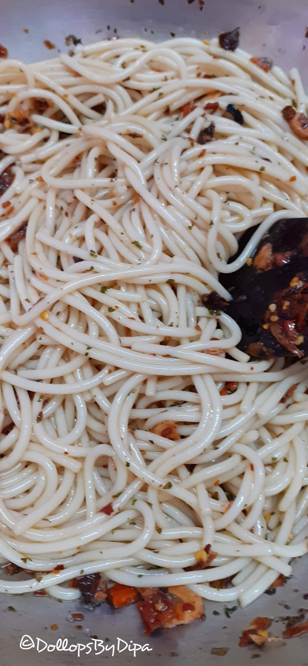 1. Heat olive oil, add mixed herbs and saute for 1 minutes on low flame. Then add boiled spaghetti, salt and mix well and turn off the heat after 1 minute.