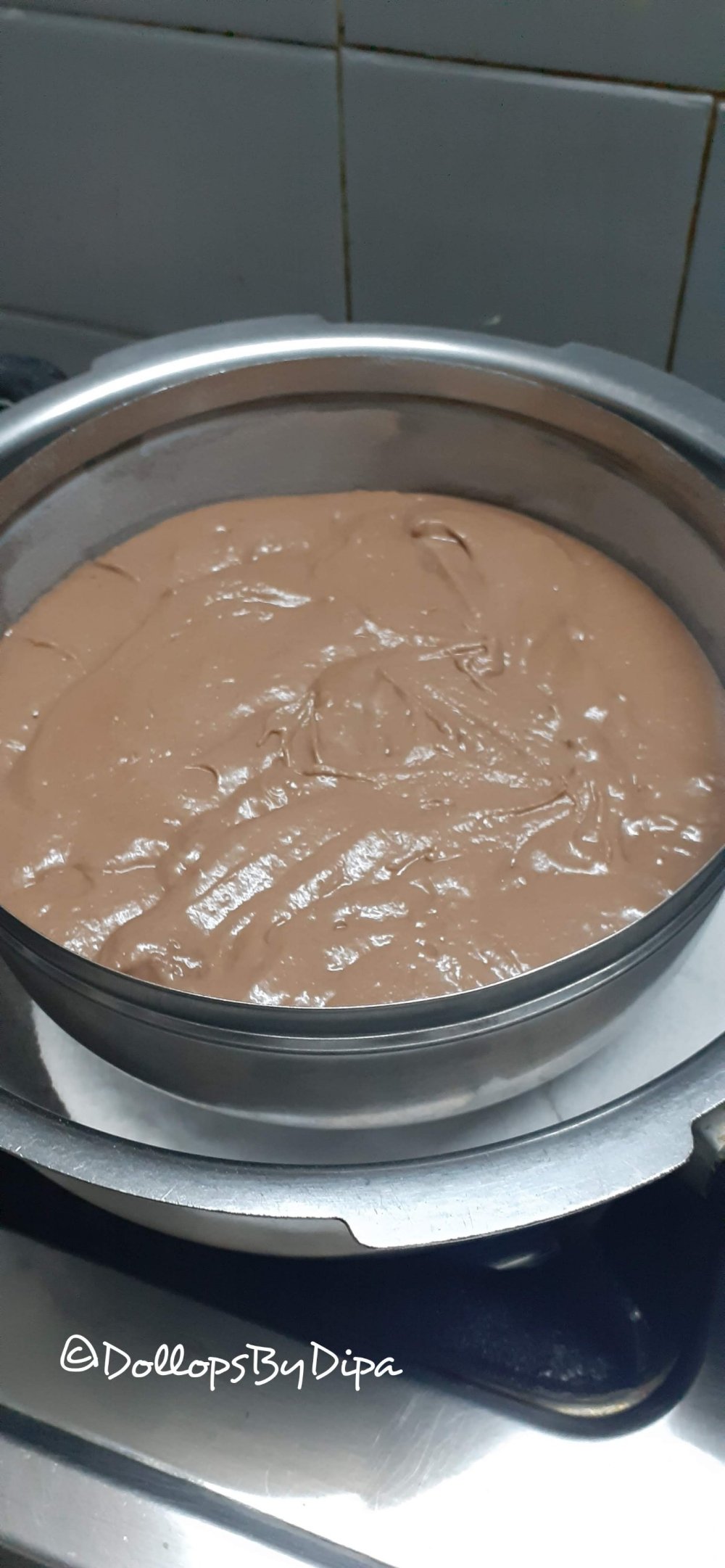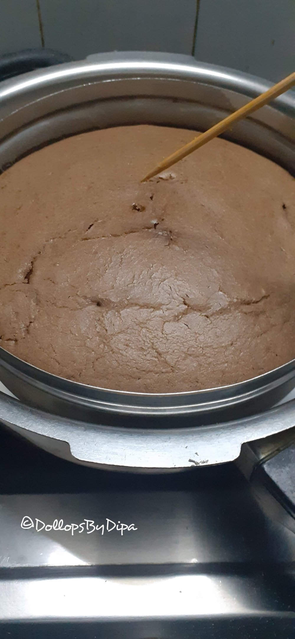 8. Place this pan in the heated pressure cooker and cover it again and let the cake be steam cooked on slow flame for about 25 minutes.