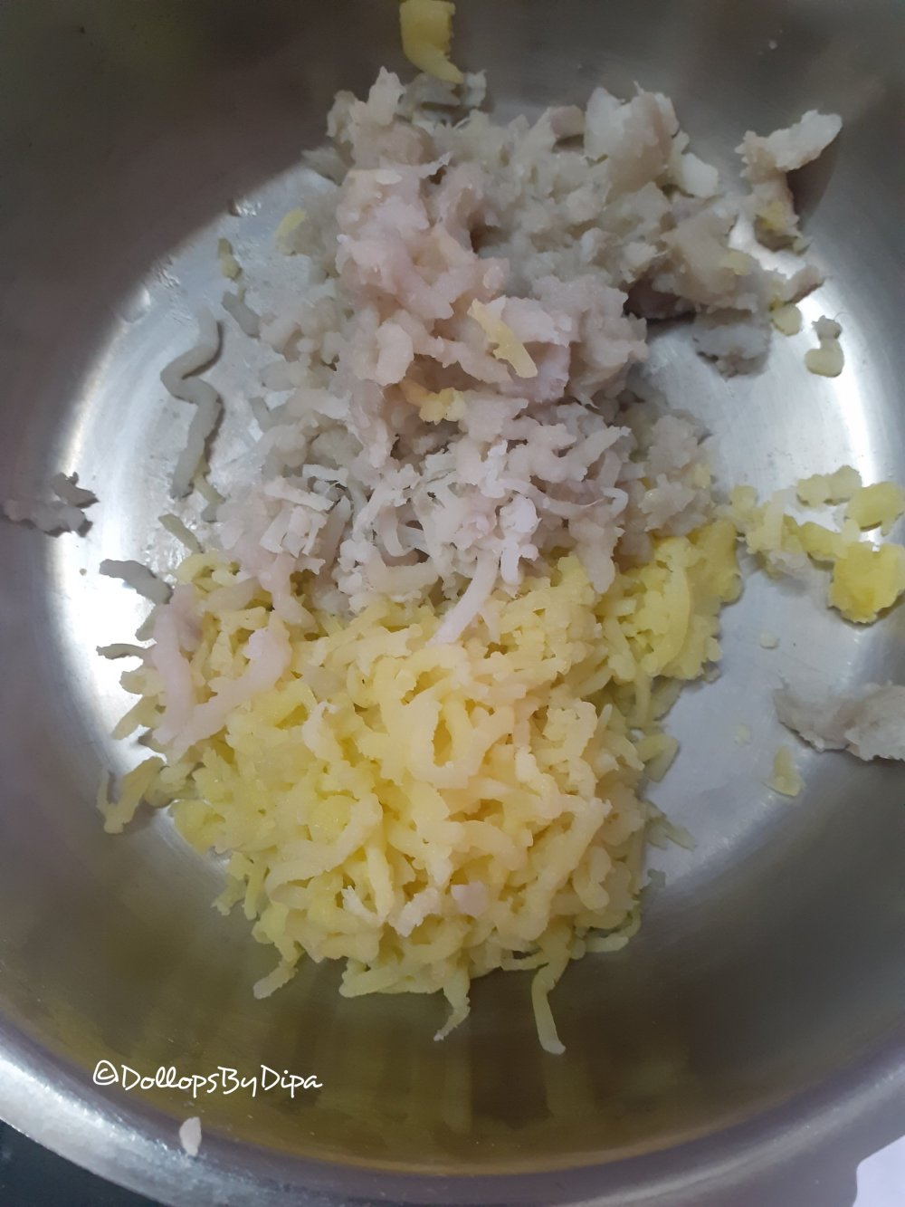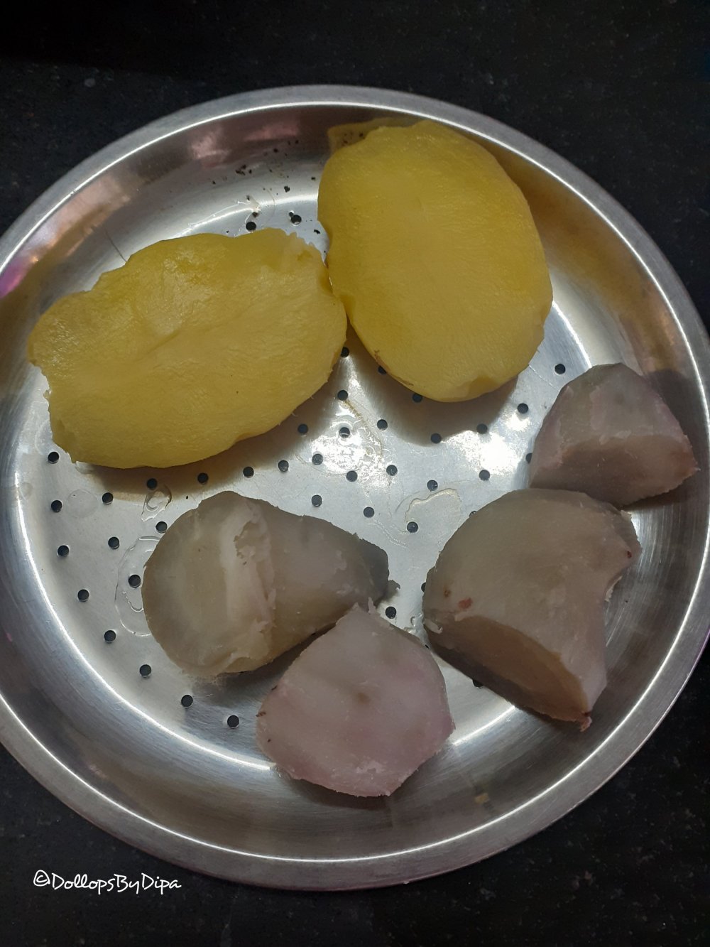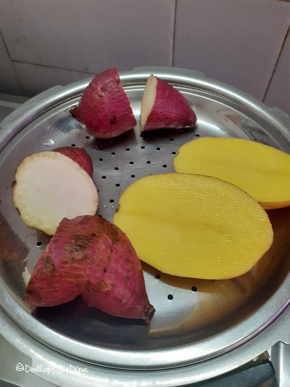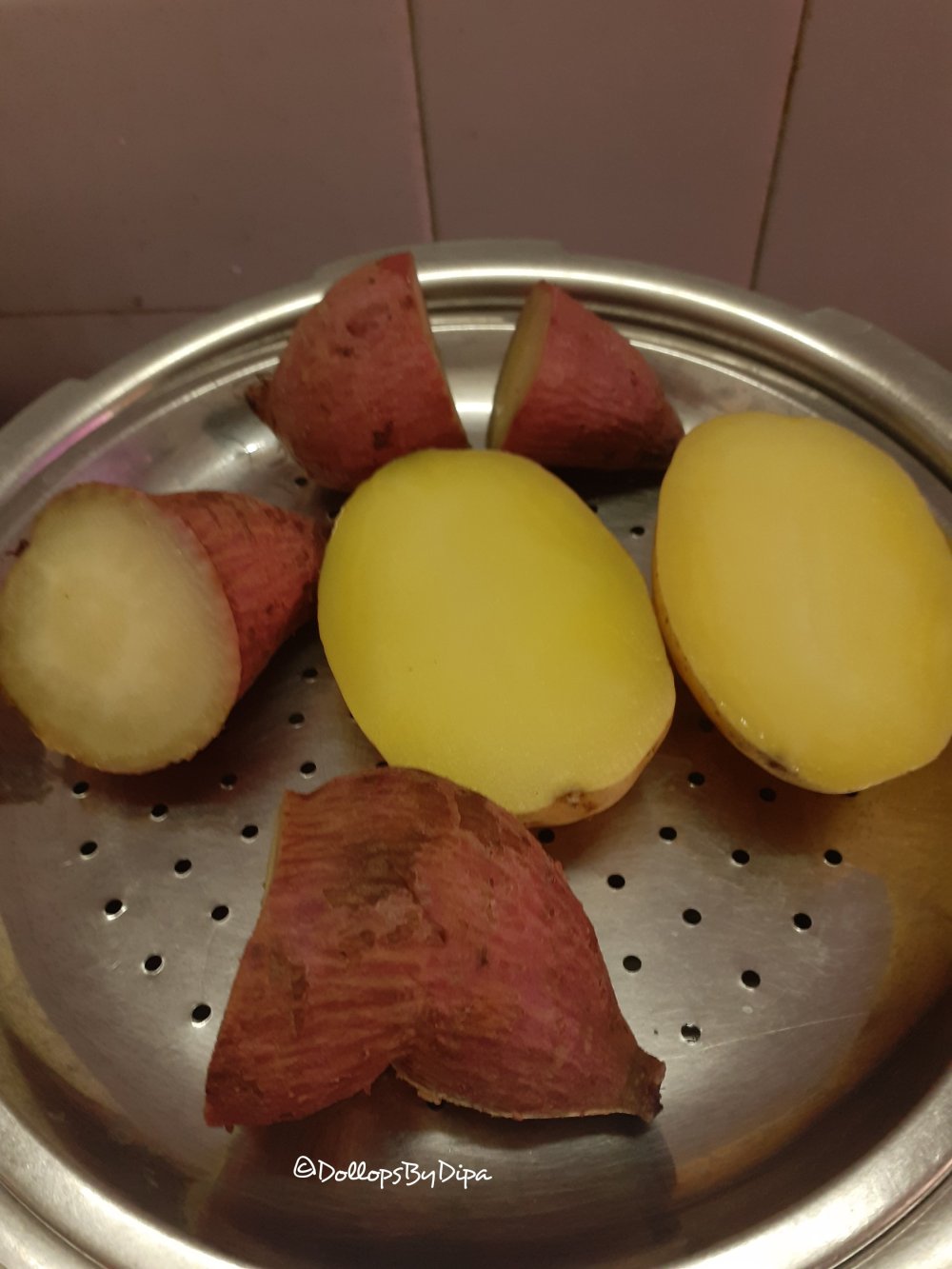 1. Wash and steam cook both potatoes for 10-15 minutes or until it cooks.
