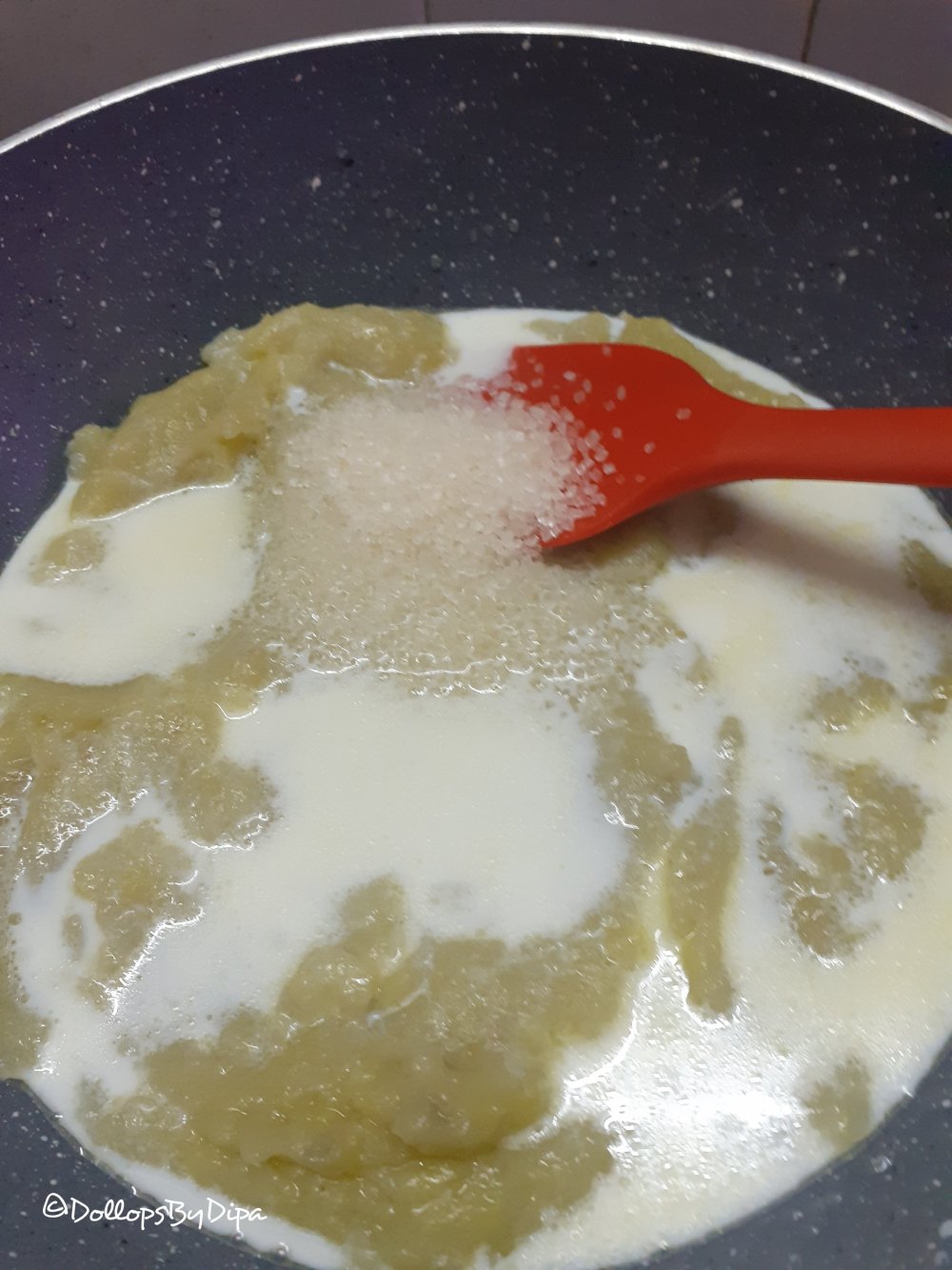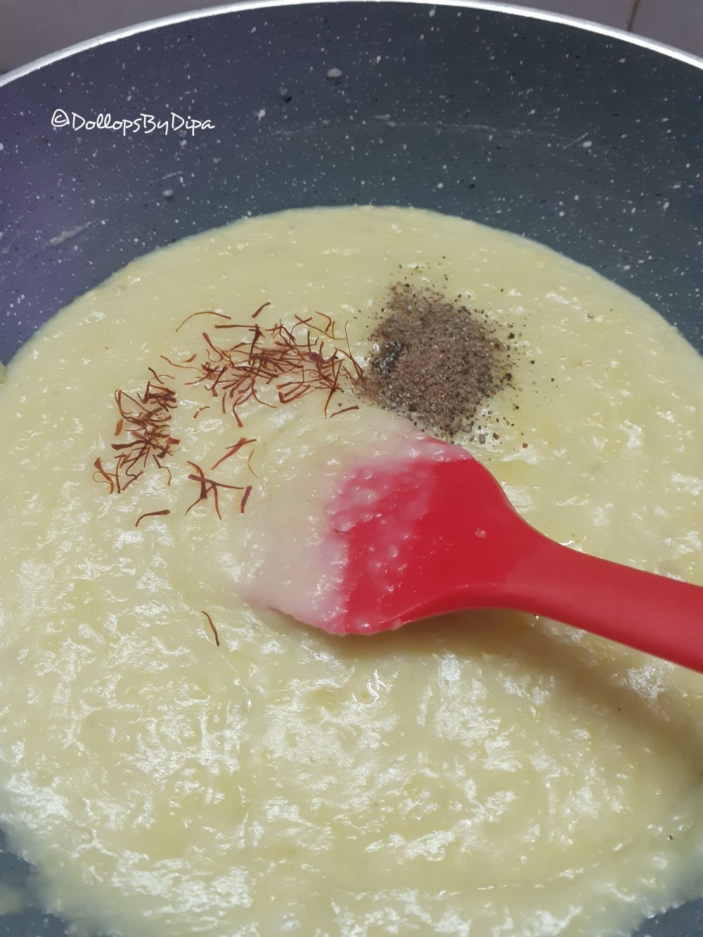 4. Then add warm milk and sugar and mix it properly, also add saffron and cardamom powder.