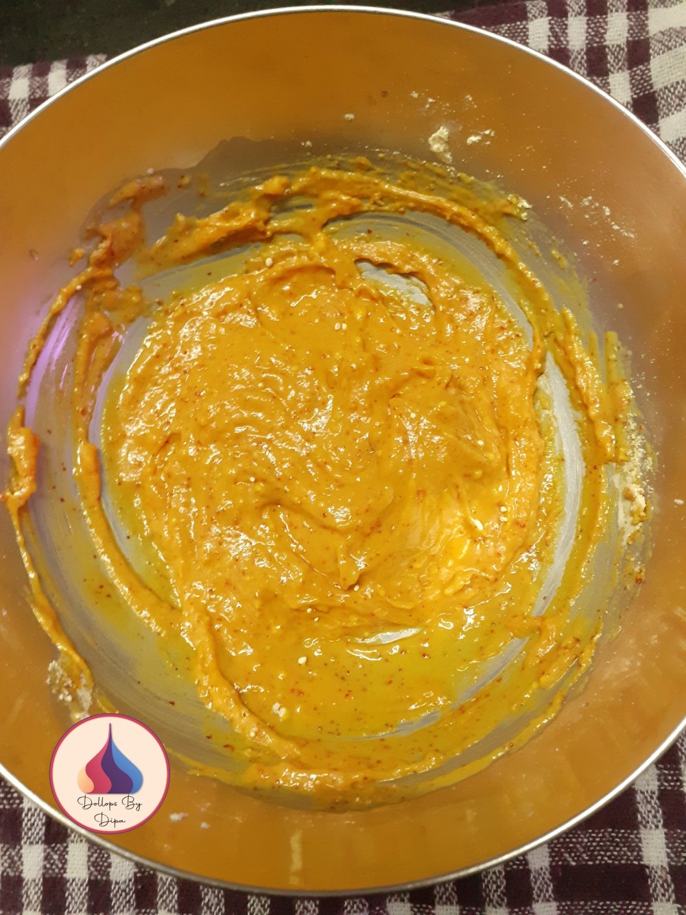 3. Add all the spices in gram flour and prepare lumpfree, thick paste like batter by adding water.