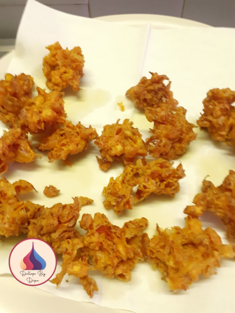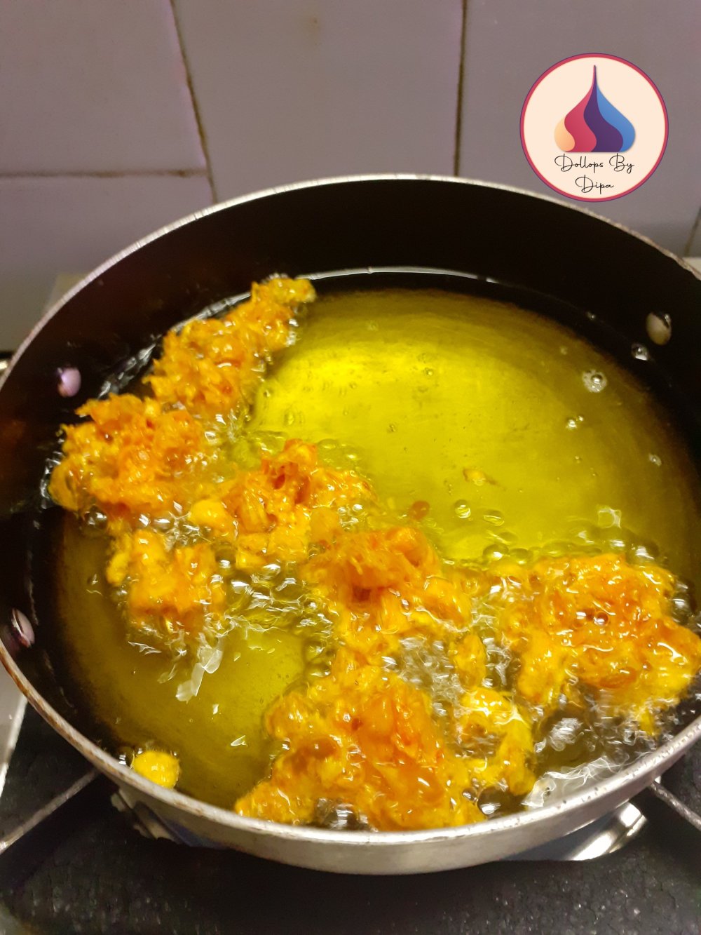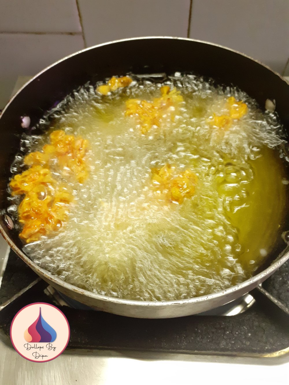 6. Heat oil, take little batter in hand and drop fritters in the oil with the help of fingers.