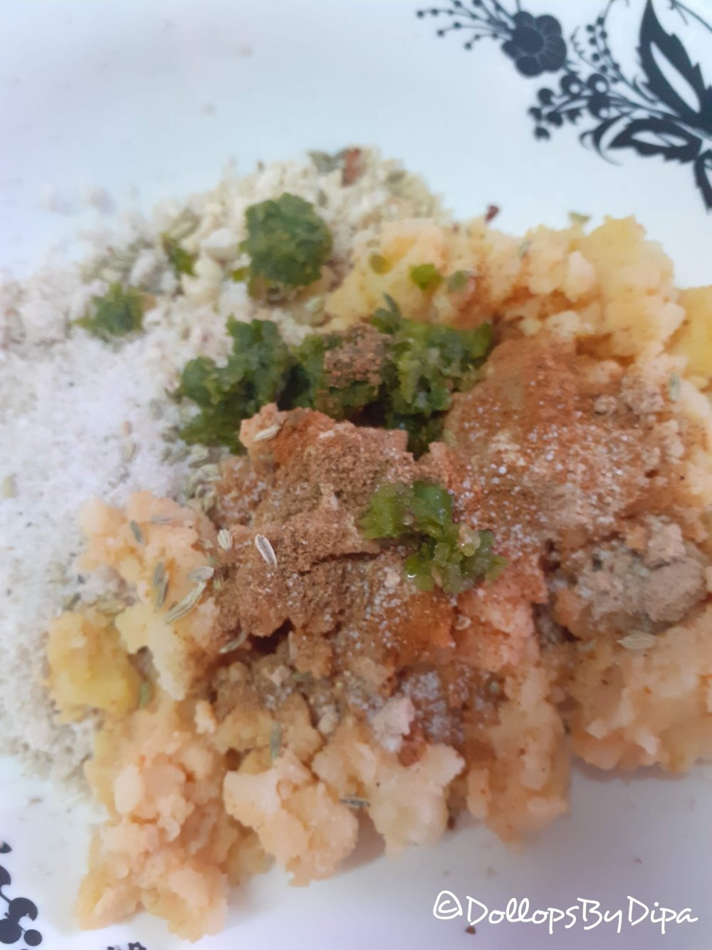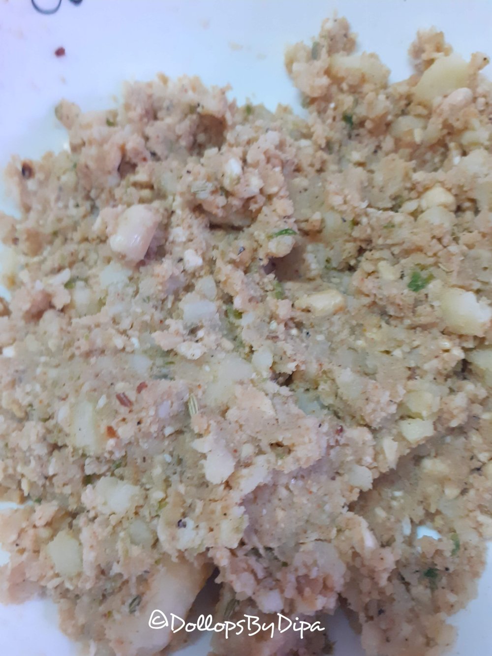 2. Now in a bowl, add mashed potatoes, ground foxnuts, peanuts, chilli paste and all spices and salt. Mix well.