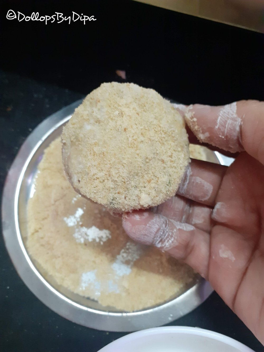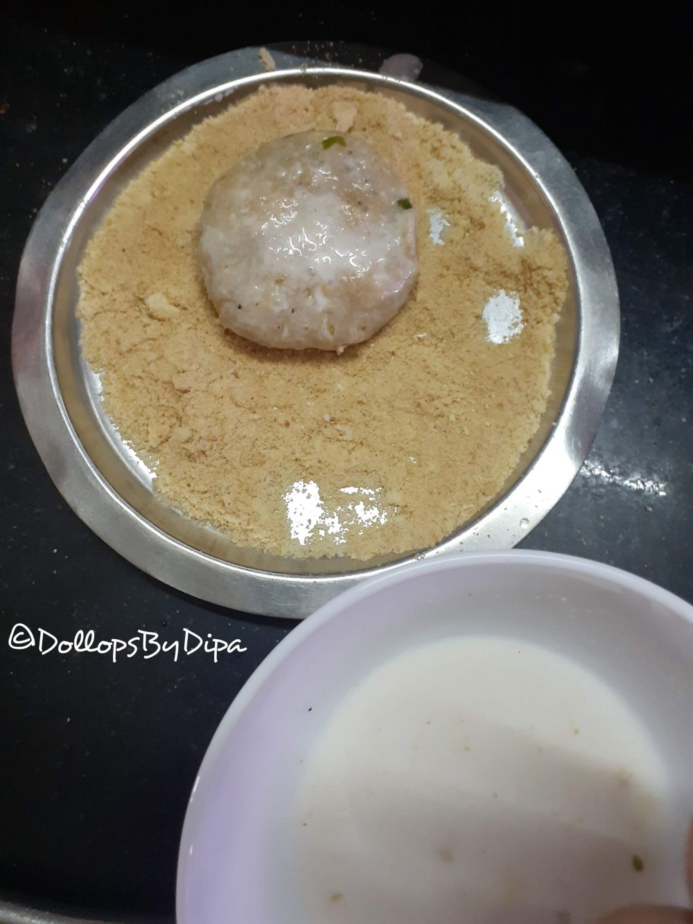 5. Turn on the flame and heat oil. Dip kebabs in a slurry and then roll it into the bread crumbs.