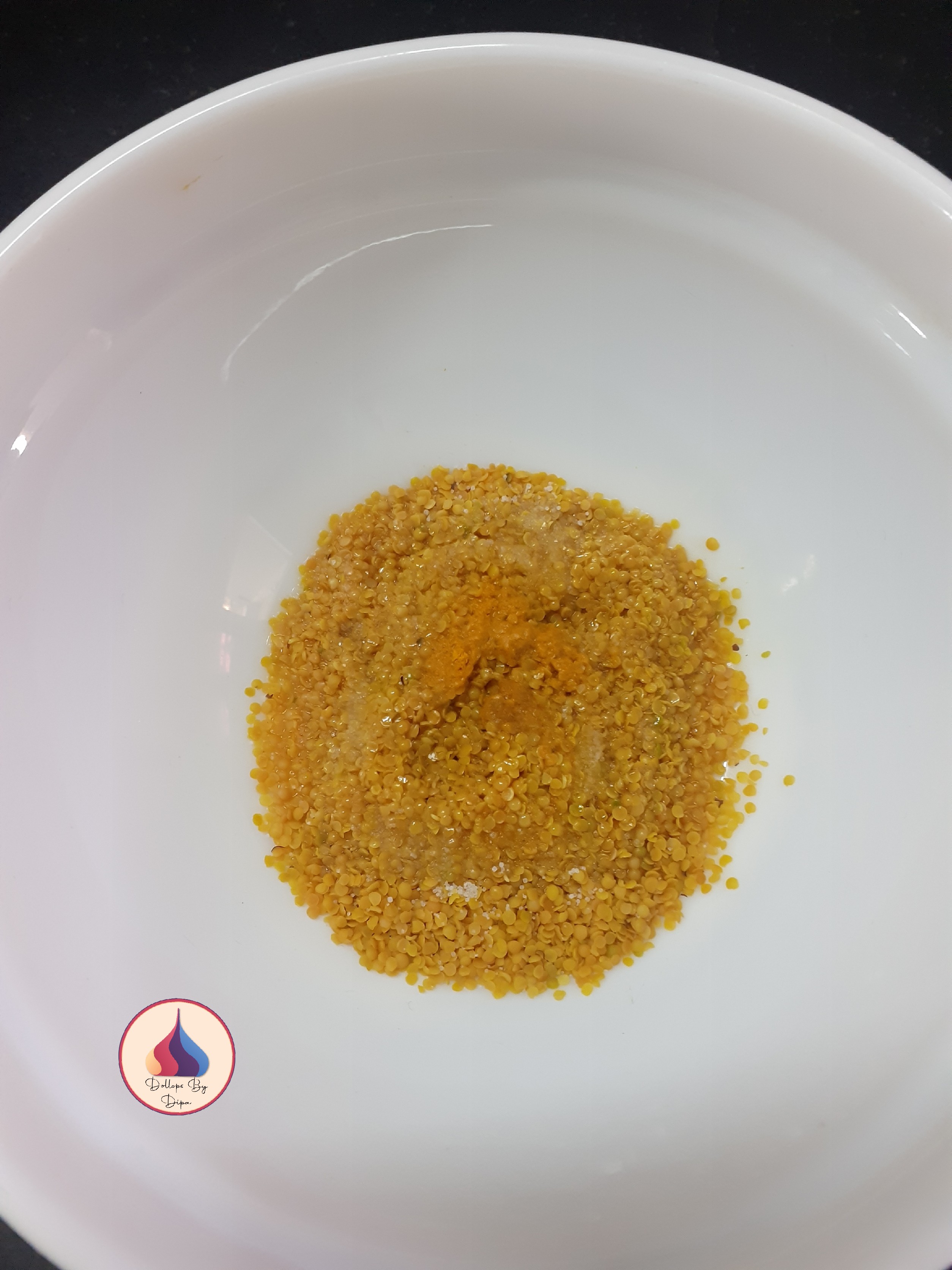 2. Now add salt and 1/2 tsp turmeric and mix well. Cover and let it rest for one hour. After one hour transfer it in a colander so excess water drains out.