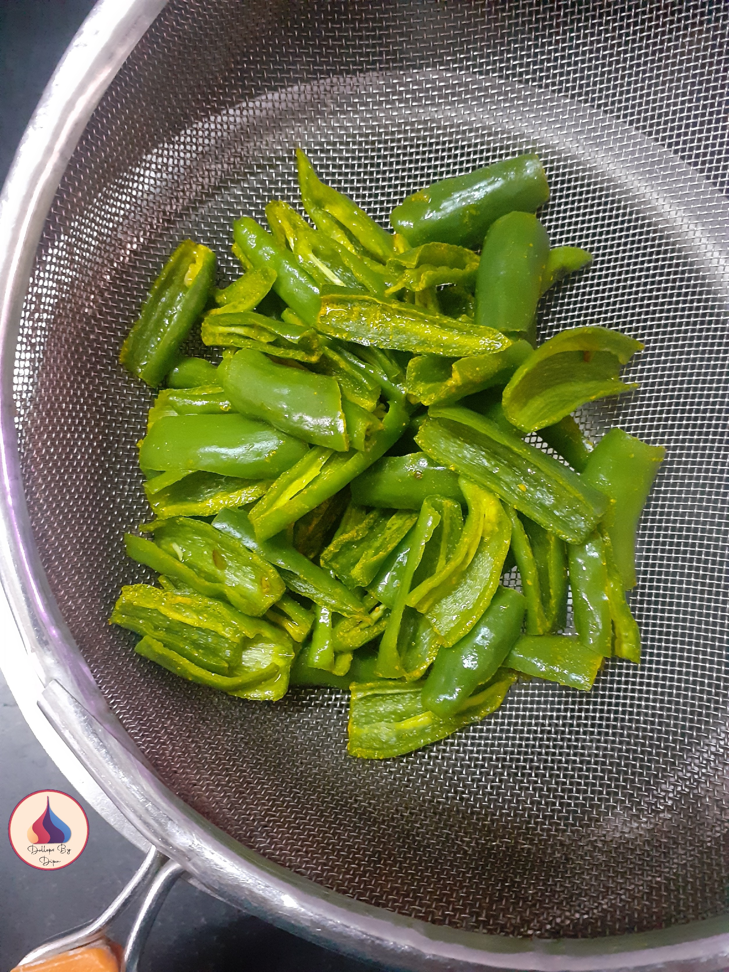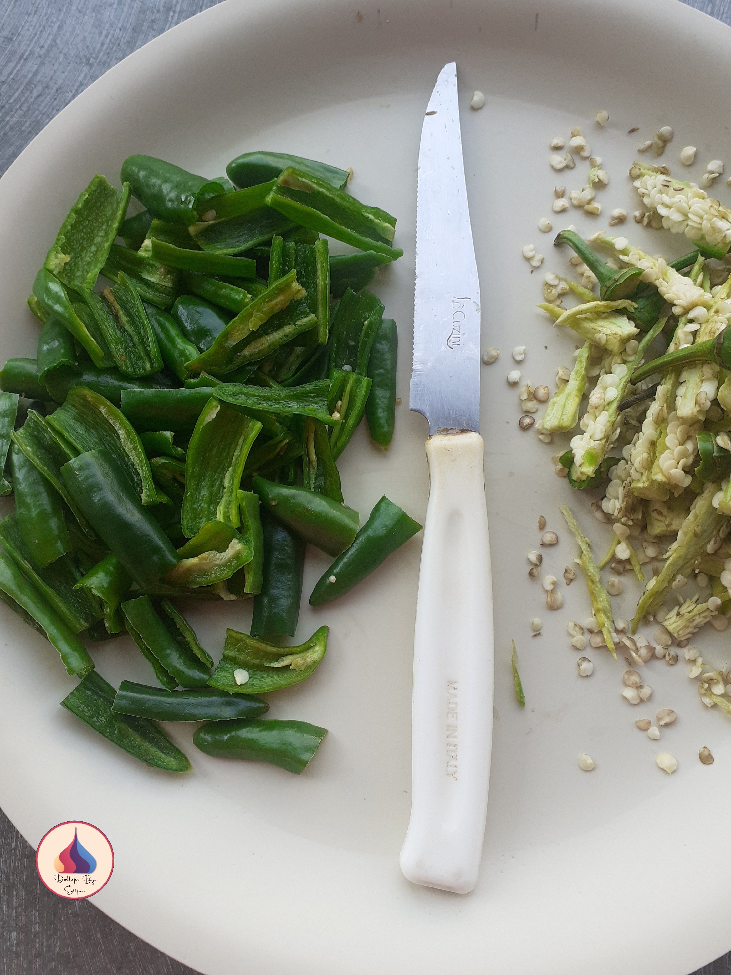 - Wash chillies , cut vertically from centre and discard the seeds and then cut in halves. Generally they are not cut in halves but for easy consumption I cut them.